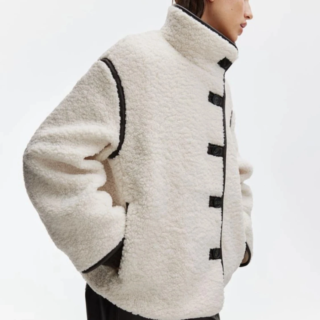 Säljer en fluffig vit teddyjacka med svarta kontrastsömmar och knappar framtill. Jackan har hög krage, långärmade och loose passform