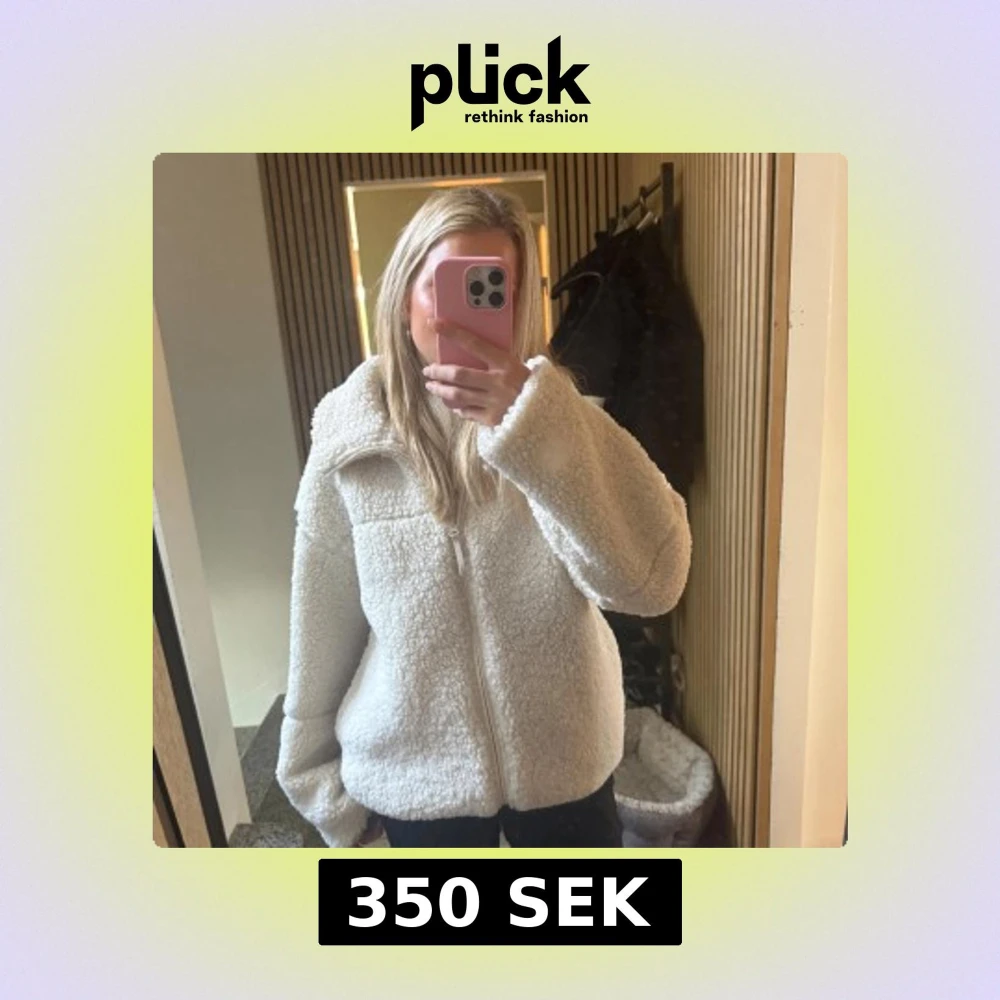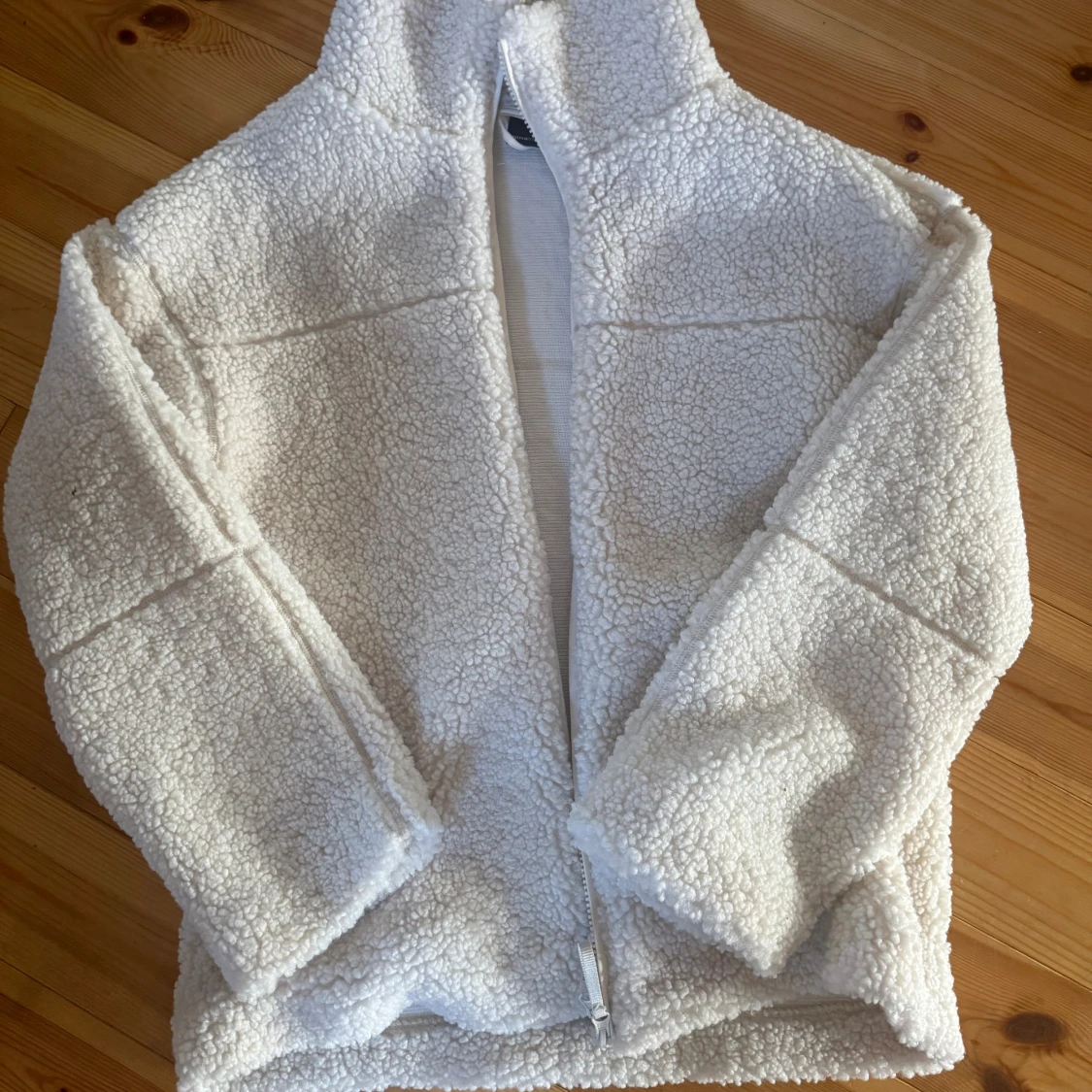 Säljer en fluffig vit teddyjacka med hög krage och dragkedja framtill. Jackan har en oversized passform och är tillverkad i mjukt fleece-material som ger en mysig vibe. Perfekt för kalla dagar och enkel att styla med jeans eller leggings.