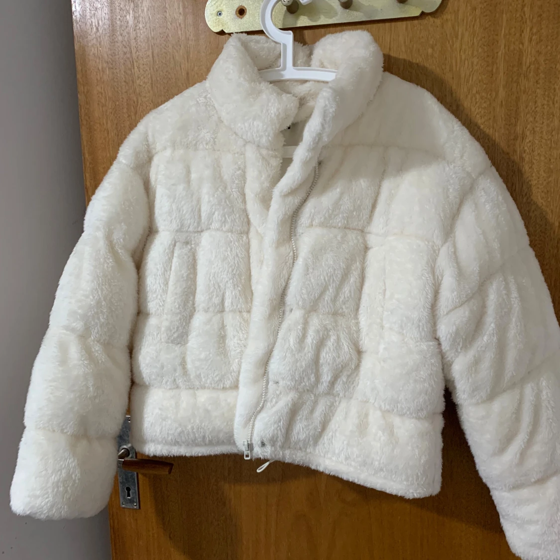 Supermjuk och fluffig vit teddyjacka med quiltad look och hög krage. Jackan har en rak, lite boxig passform och stängs med dragkedja framtill. Perfekt för att hålla värmen och se stylish ut under kyliga dagar.