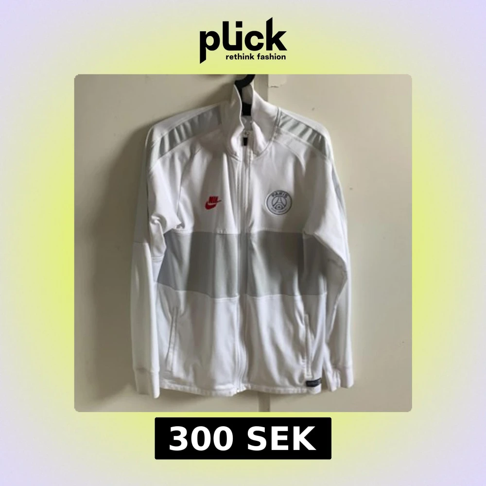Säljer en vit träningsjacka från Nike med PSG-logga på bröstet. Jackan har en dragkedja framtill och är tillverkad i polyester. Den har långa ärmar och en grå rand över bröstet och ryggen. Perfekt för fotbollsfans!