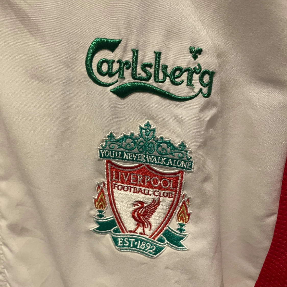 Säljer en vit vindjacka från Adidas med Liverpool FC-logga och Carlsberg-tryck. Jackan har svarta och röda detaljer samt dragkedja framtill. Perfekt för Liverpool supporter.