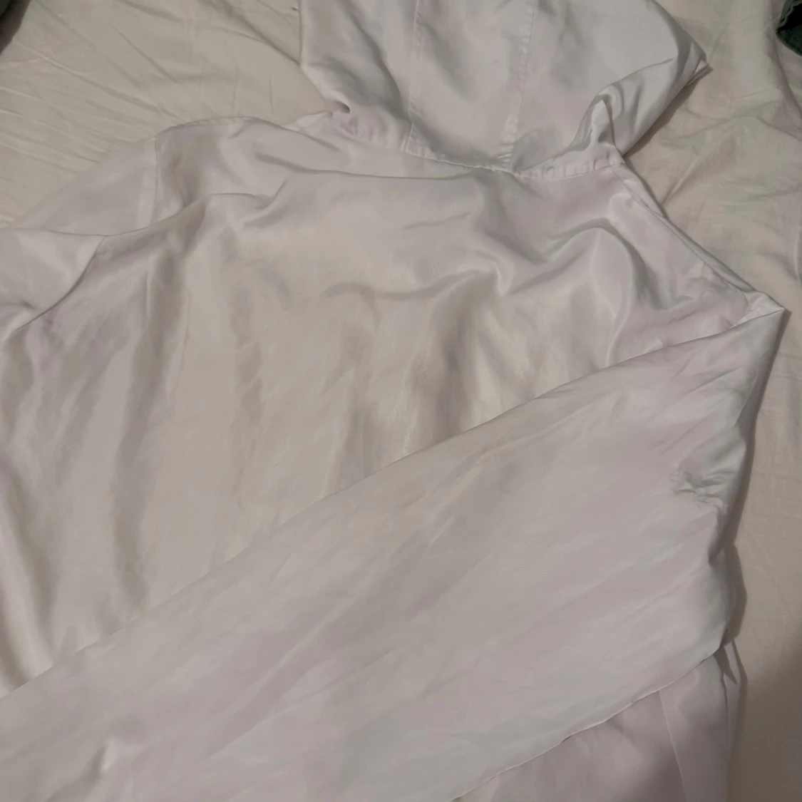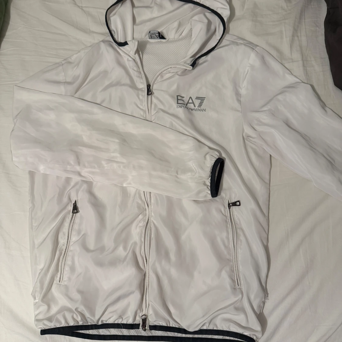 Snygg vit vindjacka från Emporio Armani med dragkedja och huva. Jackan har två praktiska fickor med dragkedjor och en stilren logga på bröstet. Perfekt för blåsiga dagar.