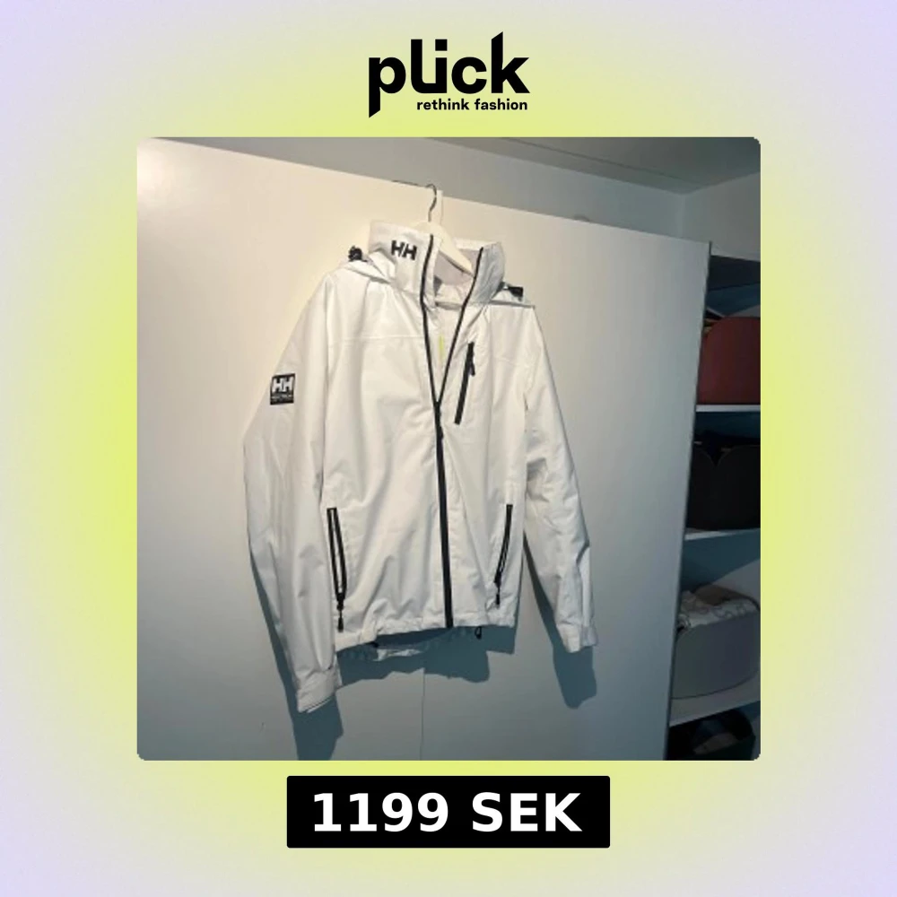 Säljer en stilren vit vindjacka från Helly Hansen med justerbar huva och dragkedja framtill. Jackan har svarta detaljer och logotyp på ärmen och axeln. Perfekt för blåsiga och regniga dagar.