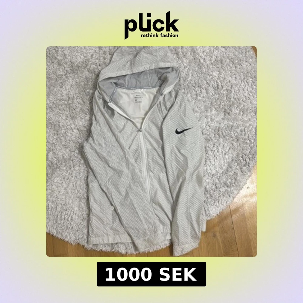 Säljer en vit vindjacka från Nike med ett diskret rutmönster och svart logga på bröstet. Jackan har dragkedja och huva, perfekt för sportiga aktiviteter. Den är tillverkad i syntetmaterial och har en stilren design.