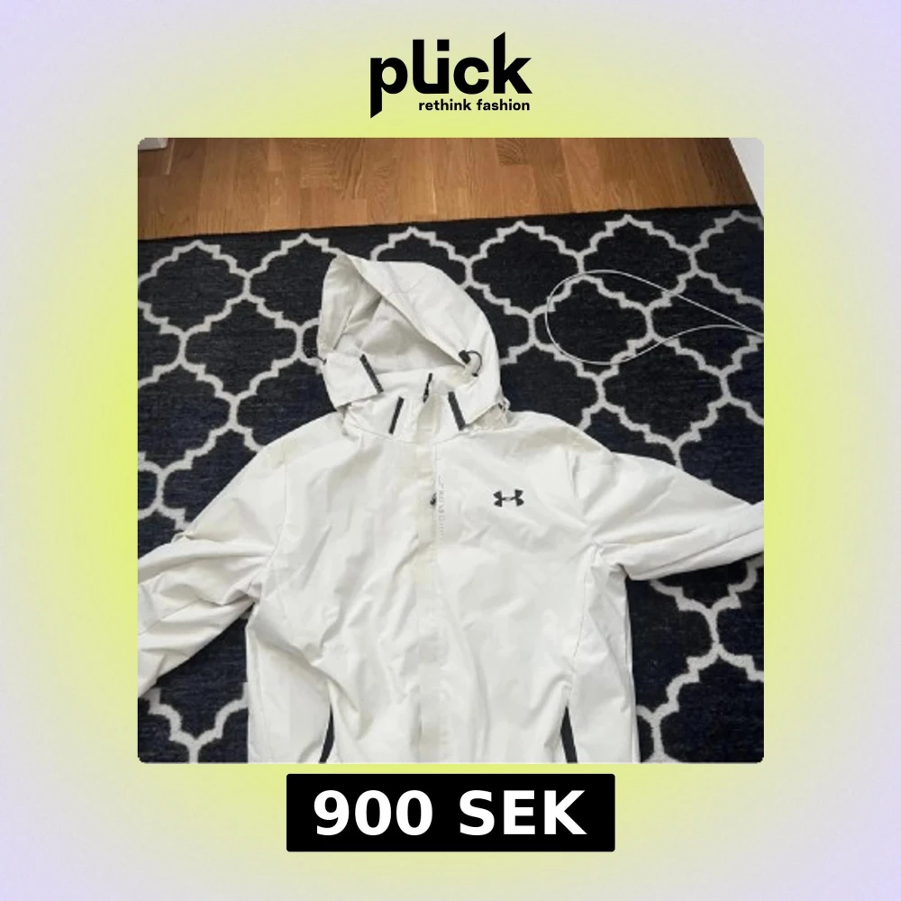 Snygg vit vindjacka från Under Armour med huva och dragkedja framtill. Jackan har meshfoder på insidan och är tillverkad i ett lätt, vatten- och vindtåligt material. Perfekt för blåsiga dagar och sportiga outfits. Köpt för 1300kr, knappt använd och är i bra skick