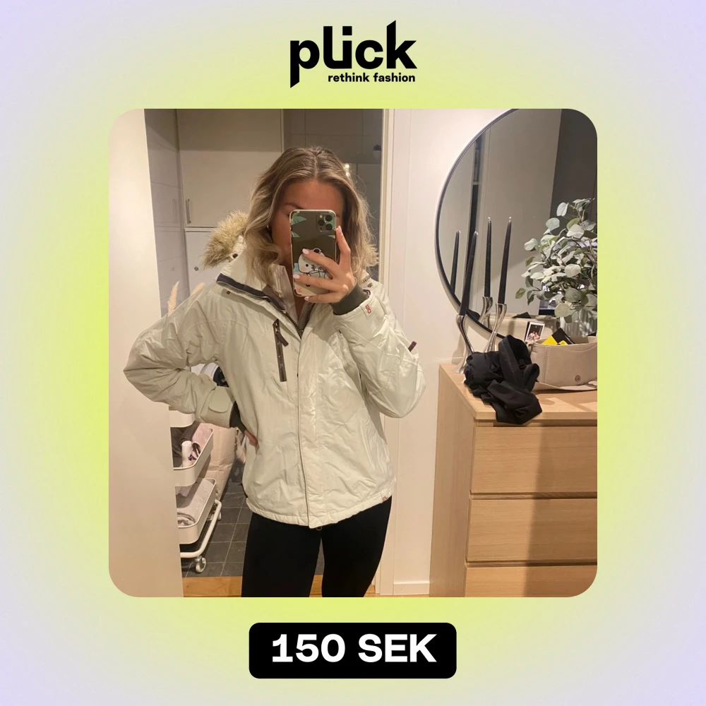 Säljer en vit vinter/skidjacka från Didriksons med pälskrage. Jackan har dragkedja och flera praktiska fickor för bland annat skidåkning. Storleken är mellan S och M.