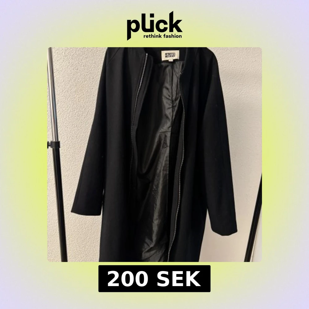 Säljer en svart lång jacka från Weekday med minimalistisk design och rak passform. Jackan har dragkedja framtill och är helsvart både in- och utvändigt. Perfekt för dig som gillar stilrena plagg.