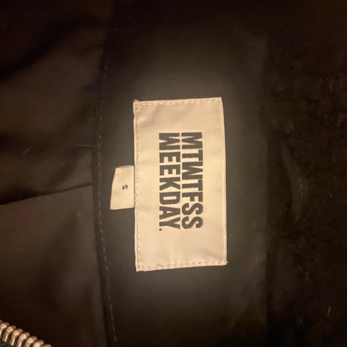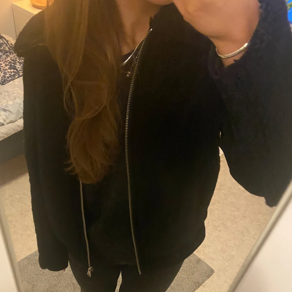 Svart teddyjacka från Weekday i storlek s. Den har typ läderdetaljer vid fickorna och ärmarna priset kan diskuteras 🤍