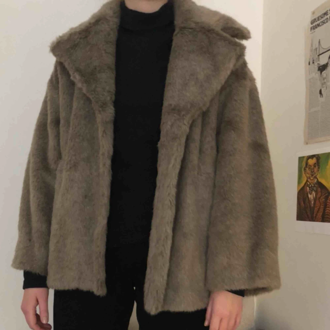 Gråbrun fuskpällsjacka från Weekday. Sparsamt använd och skulle säga att den passar upp till storlek L beroende på hur oversize man vill att den ska sitta (jag är 180 cm)!