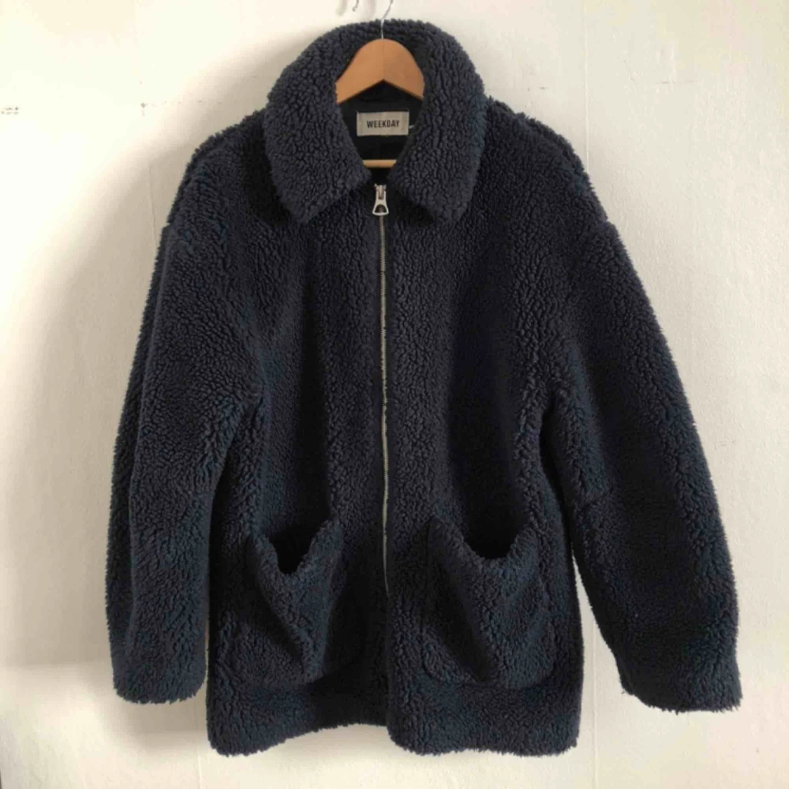 Marinblå luddig jacka från Weekday, använd. Köparen står för frakten, 96 kr.