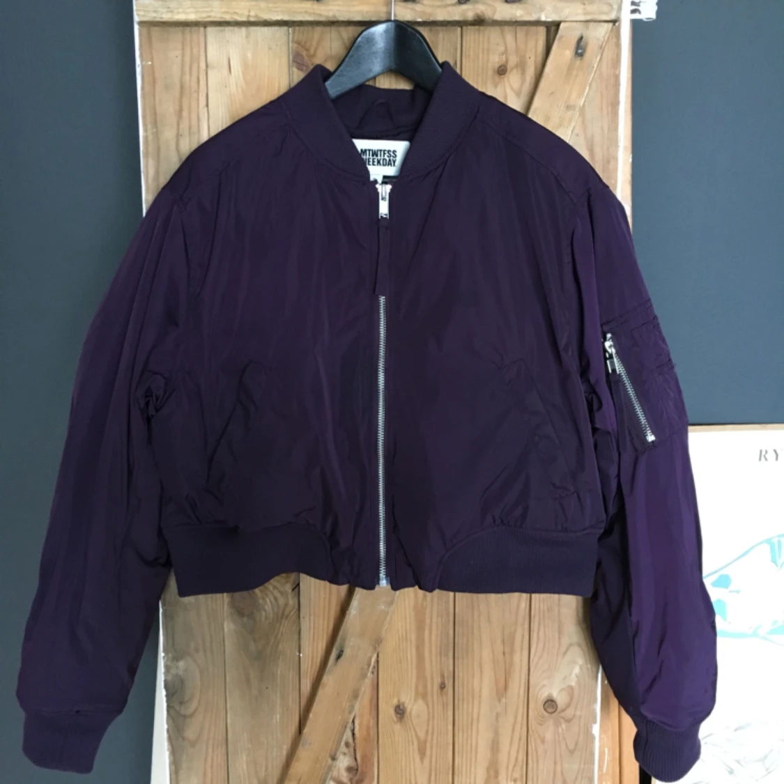 Kortare bomberjacka från Weekday. Kan ta mått om det behövs. Den är mörkt plommonlila. Lite svårfotad färg dock. Spårbar frakt på 58kr tillkommer
