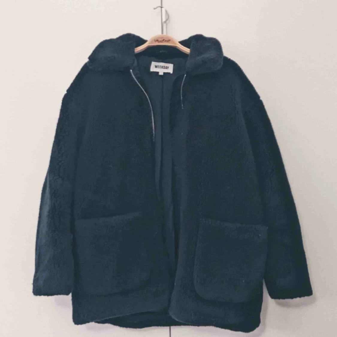Mysig teddyjacka från Weekday, obetydligt använd. Mörkblå, storlek S!