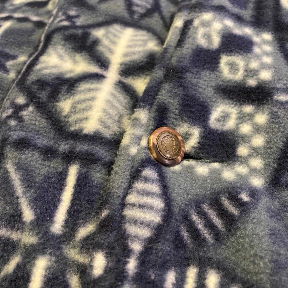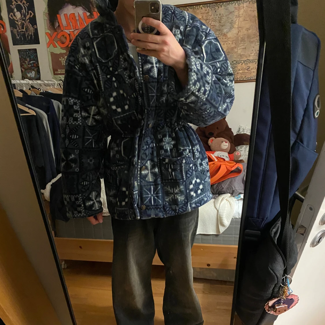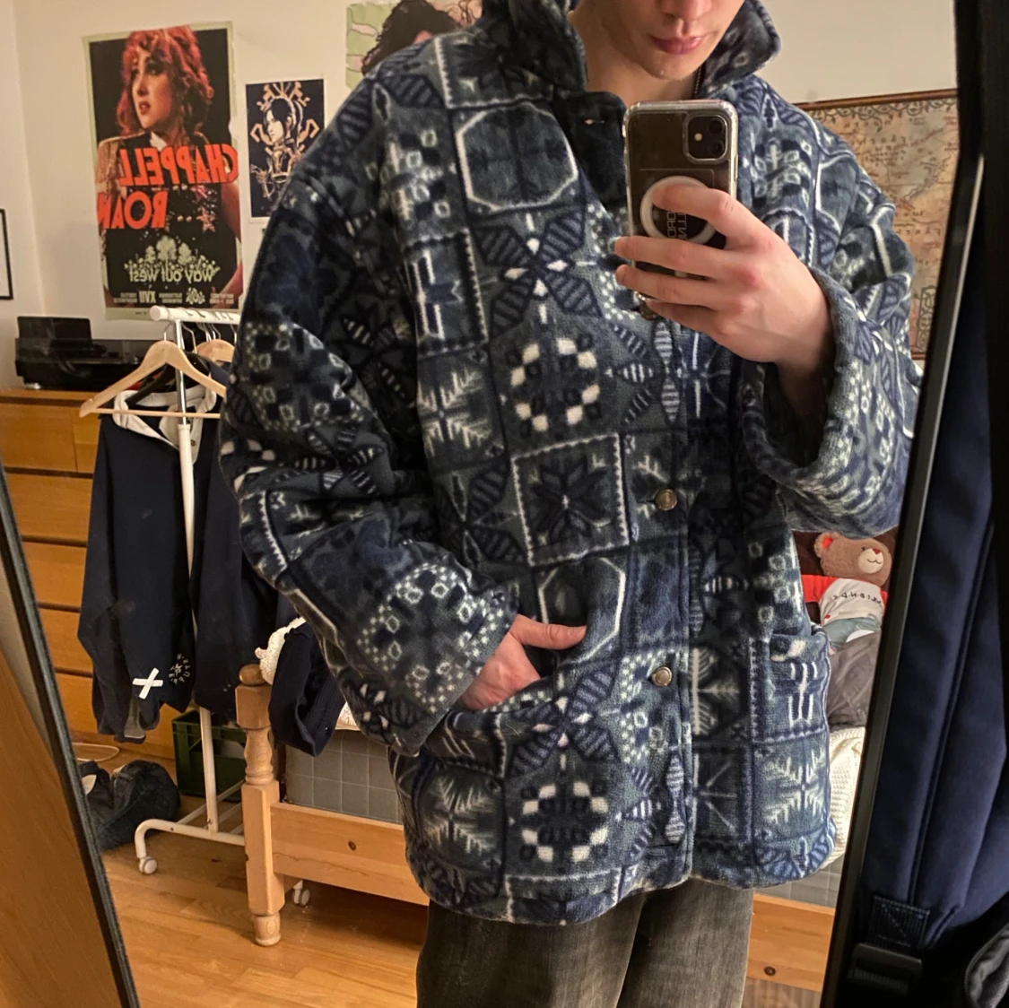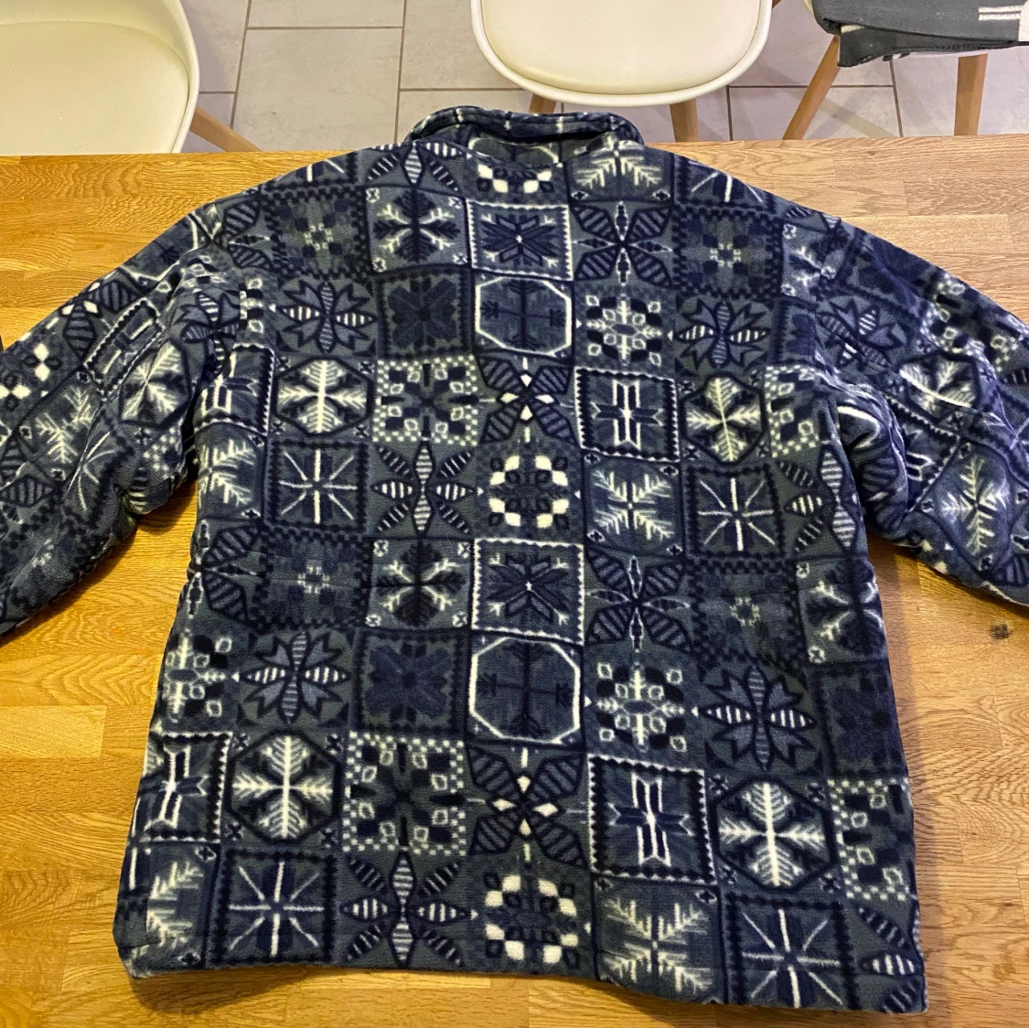 En super mysig vinter jacka köpt i Paris. Den är väldigt stor (modell 194cm) och super gosig (fodrad på insidan. Perfekt att ha både utomhus och inumhus när det är kallt. Den är täckt av ett gulligt snöflings mönster och man kan även spänna åt den i midjan för en annorlunda pass form (se sista bilden).