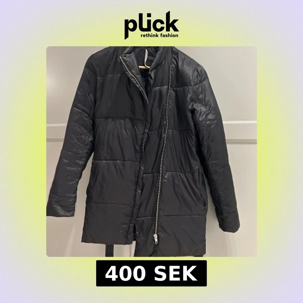 Snygg svart pufferjacka från Whyred med dragkedja och bälte i midjan. Jackan har en quiltad design och långa ärmar, perfekt för kyligare dagar. Stilren och enkel att matcha med olika outfits.