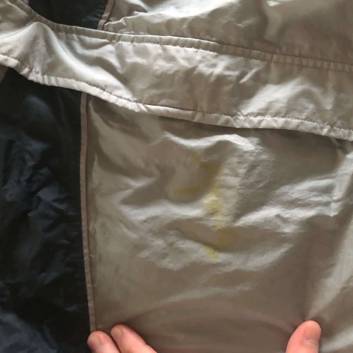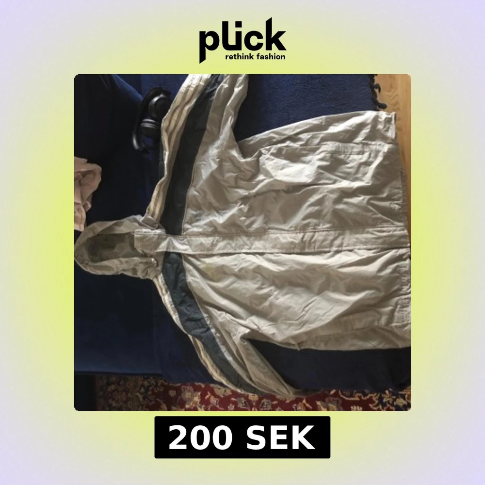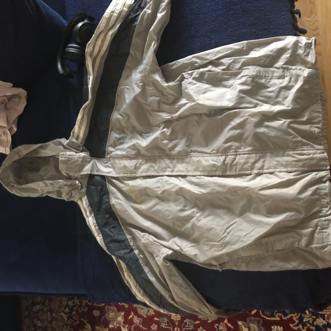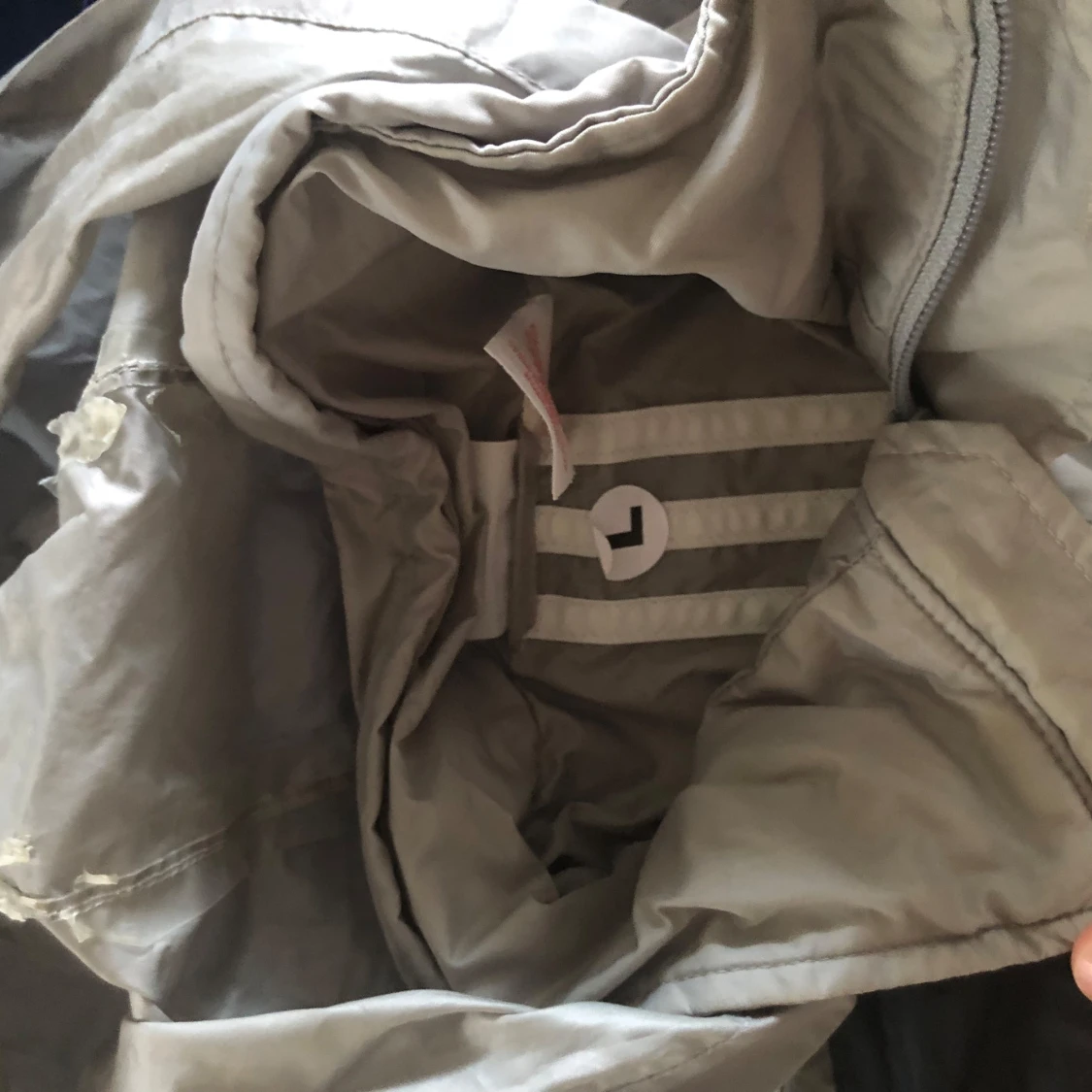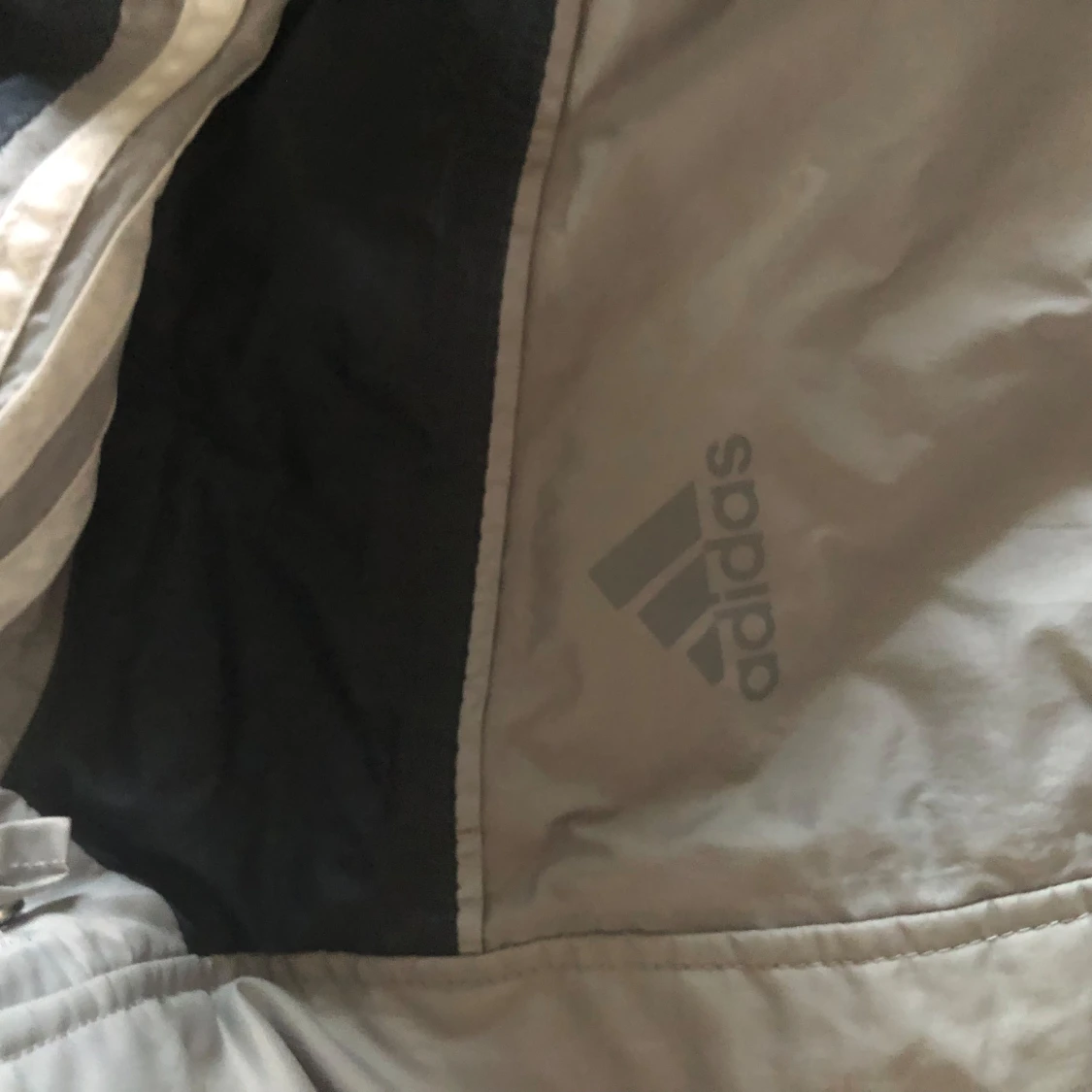 Säljer en beige vindjacka från Adidas med huva och dragkedja. Jackan har en klassisk design med Adidas-loggan på sidan. Perfekt för blåsiga dagar och har en bekväm passform. Har gul fläck på bröstet se bild