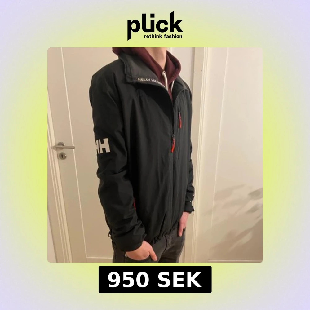 Säljer en svart vindjacka från Helly Hansen med dragkedja och logotyp på ärmen. Jackan har långa ärmar och en stilren design, perfekt för blåsiga dagar. Den har även praktiska fickor med dragkedjor. Han på bilden är 175