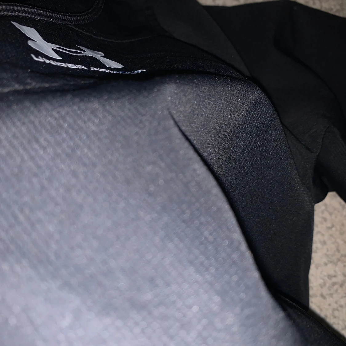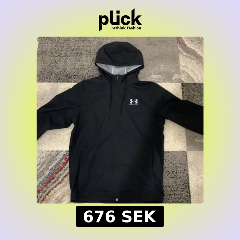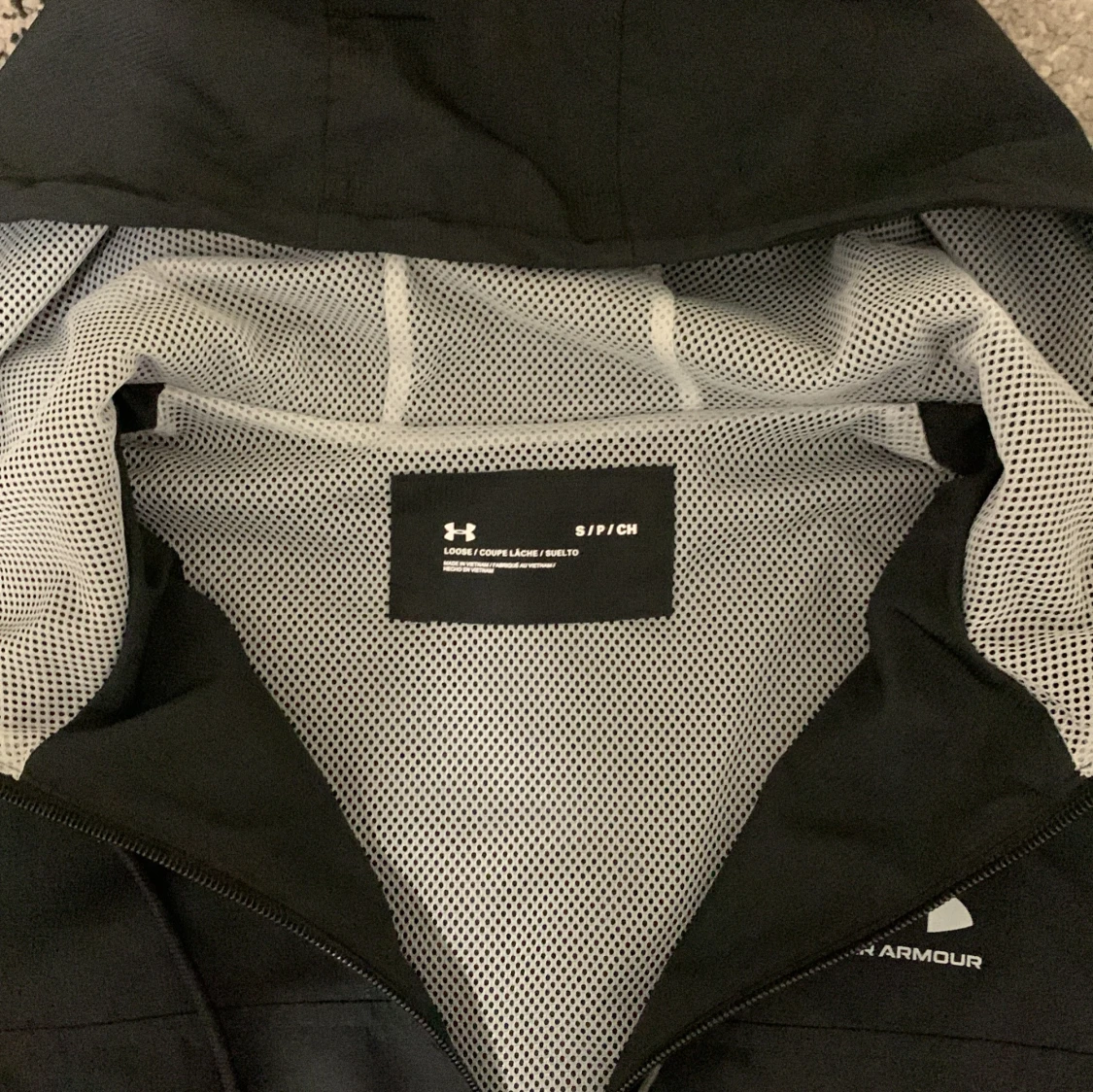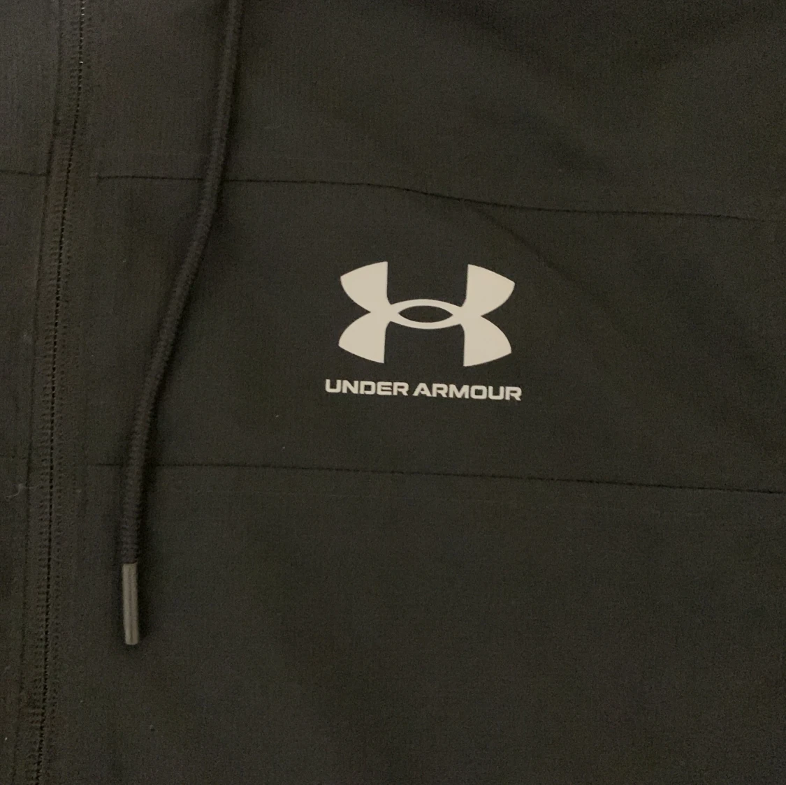 Säljer en svart vindjacka från Under Armour med huva och dragkedja. Jackan har en stilren design med logotyp på bröstet och är perfekt för blåsiga dagar. Den har en lös passform och är tillverkad i syntetmaterial för att stå emot väder och vind.
