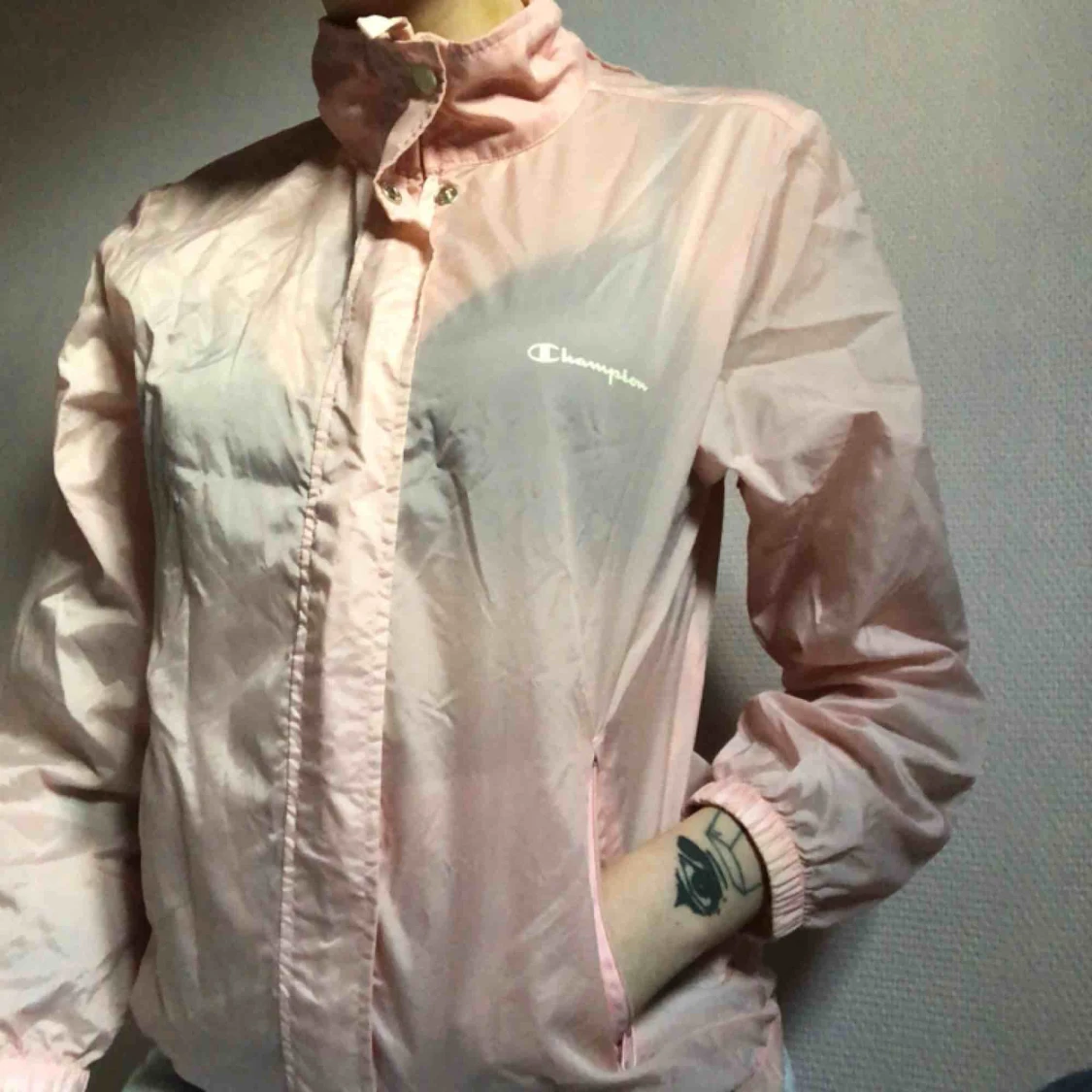 Pastellrosa windbreaker från champion, köpt second hand. Står strl 155 men är ganska stor, passar XS-S. Den har en luva