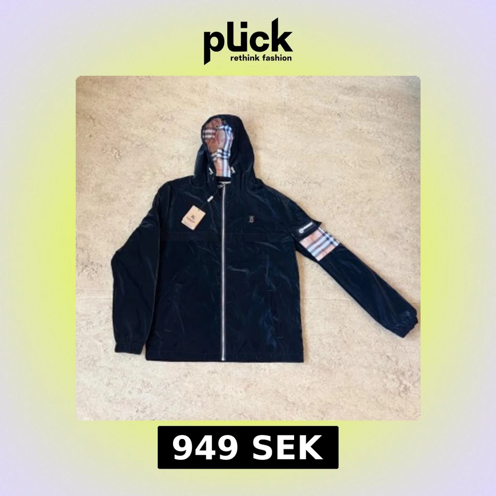 Svart vindjacka från Burberry med klassiskt rutigt foder i huvan och på ena ärmen. Jackan har dragkedja framtill, snörning i huvan och Burberry-logga på bröstet samt ärmen. Tillverkad i glansig polyester och har en loose passform. I storlek L men passar även M