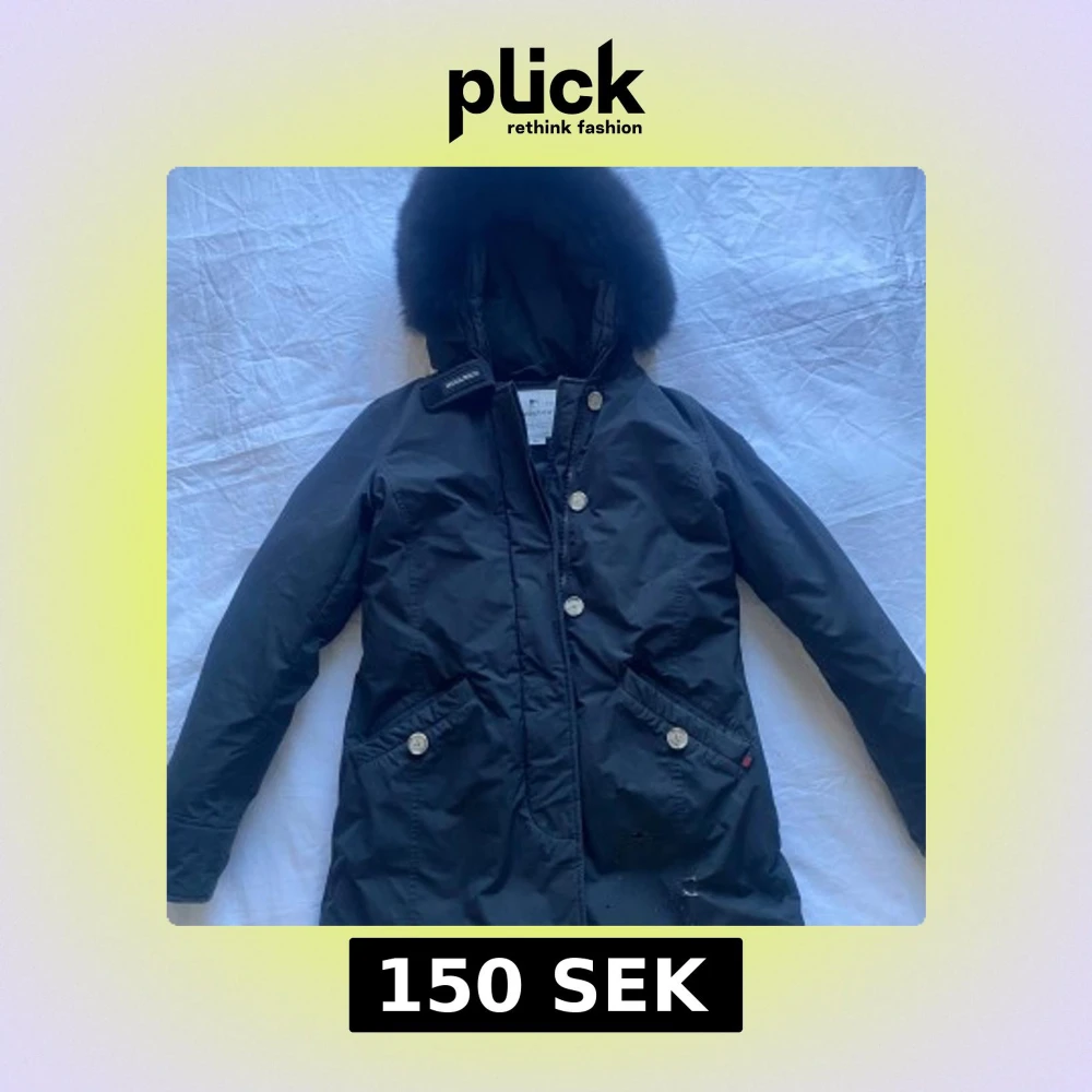 Woolrich dunjacka parka med äkta päls krage storlek XS jackan är lite använd men har stora defekter brännmärken och hål se bilder noga därav pris.