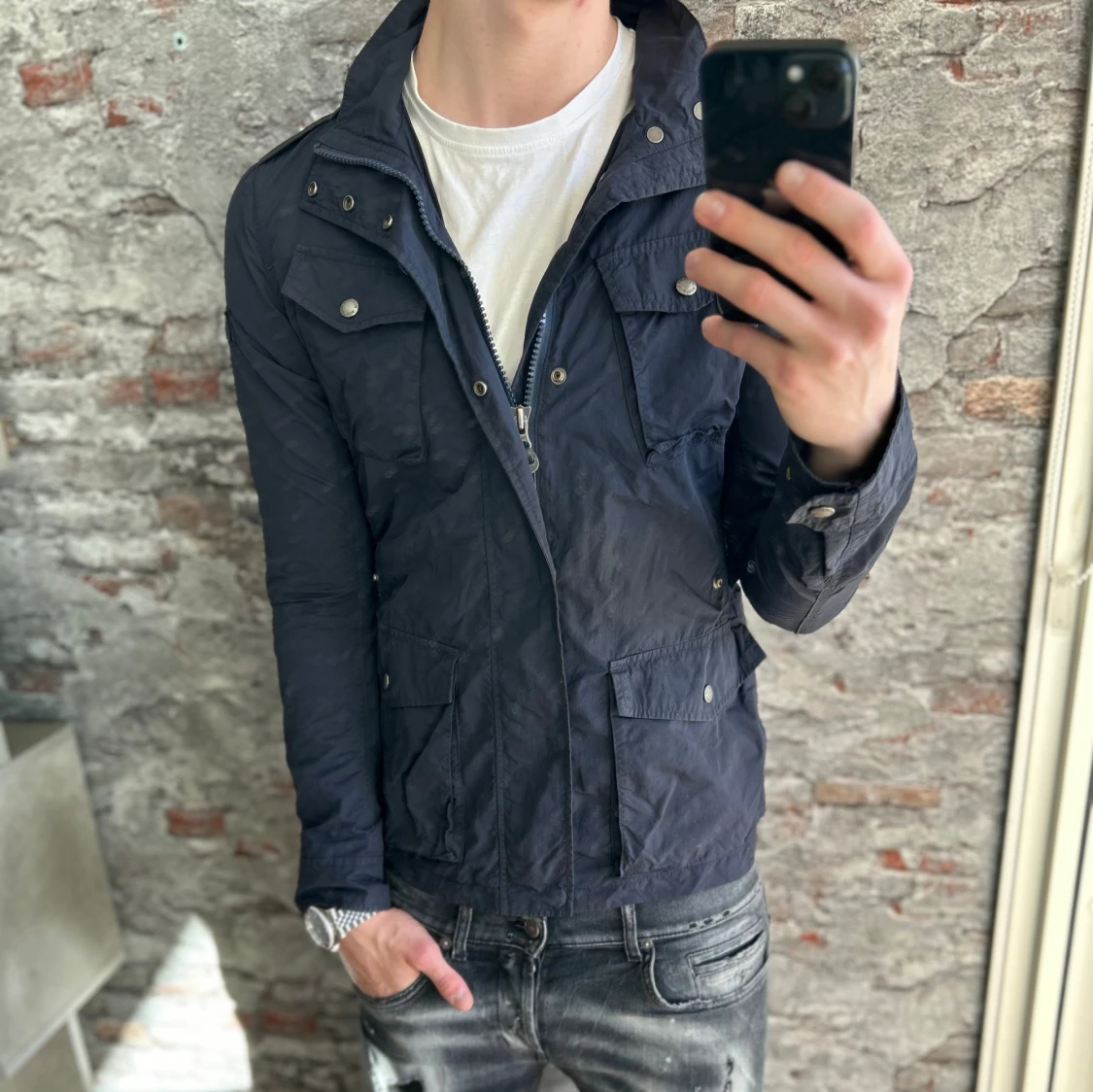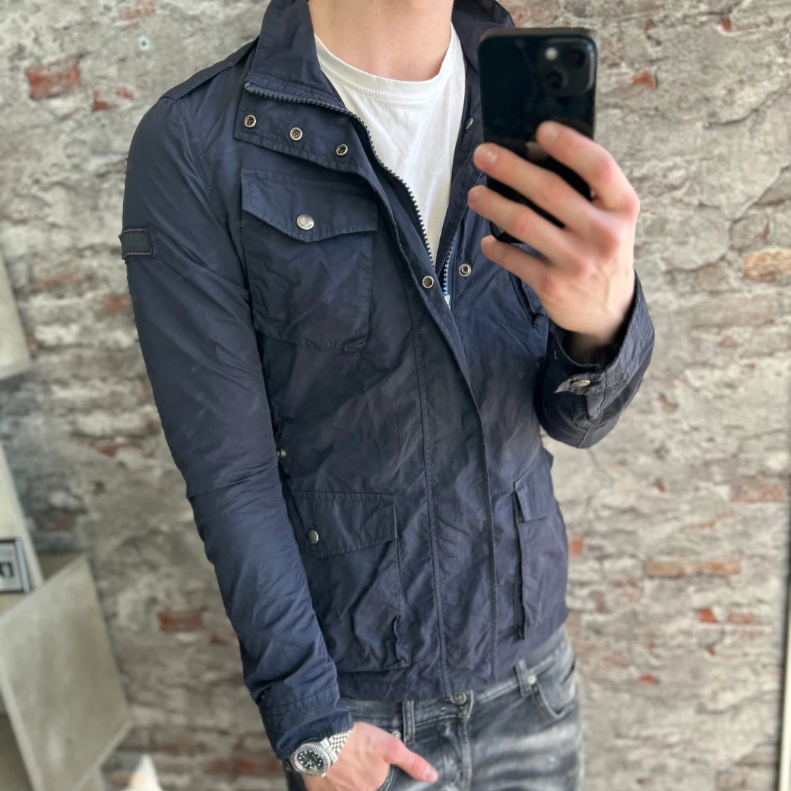 Bra skick, generellt använd och en liten skada på armen, be om bild. Storlek S passar dig som är mellan 175-180cm ungefär. Nypris ca 3000kr. Modellen är 185 cm, 79 kg. Passar bra till regn och vind. Skriv för mer information!🤝