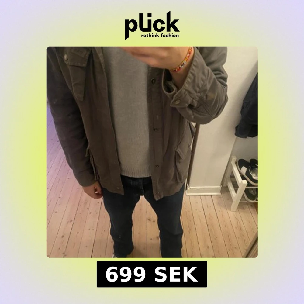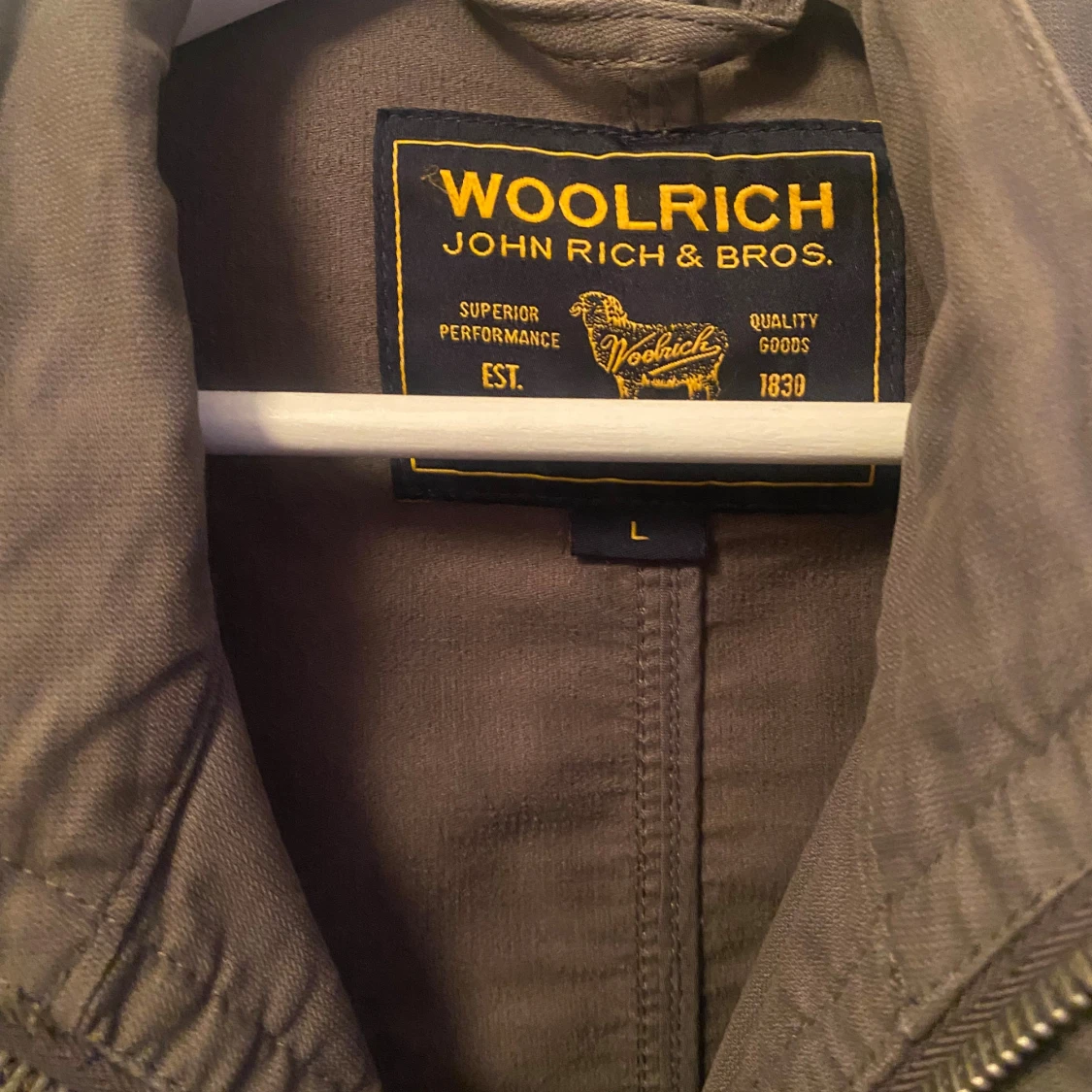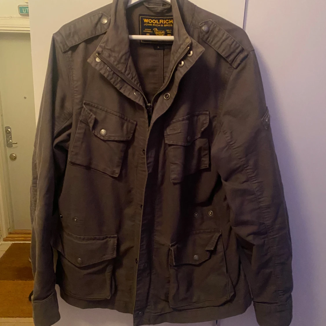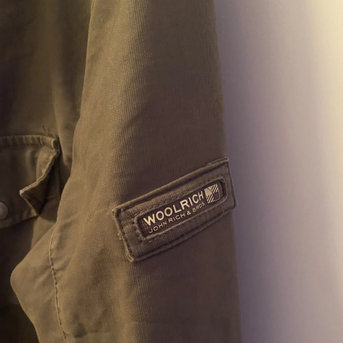 Parkajacka från Woolrich i grått med flera stora fickor framtill och axeldetaljer. Jackan har lång ärm, knappar och dragkedja samt patch med logga på ärmen. Materialet är slitstark bomull, perfekt för dig som gillar utility-vibe. Storlek L. Jag är 190 på bilden