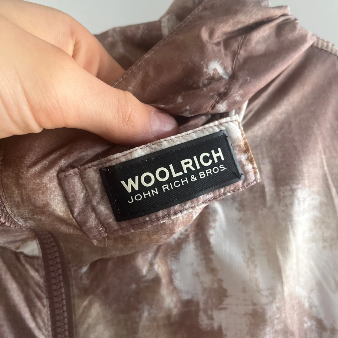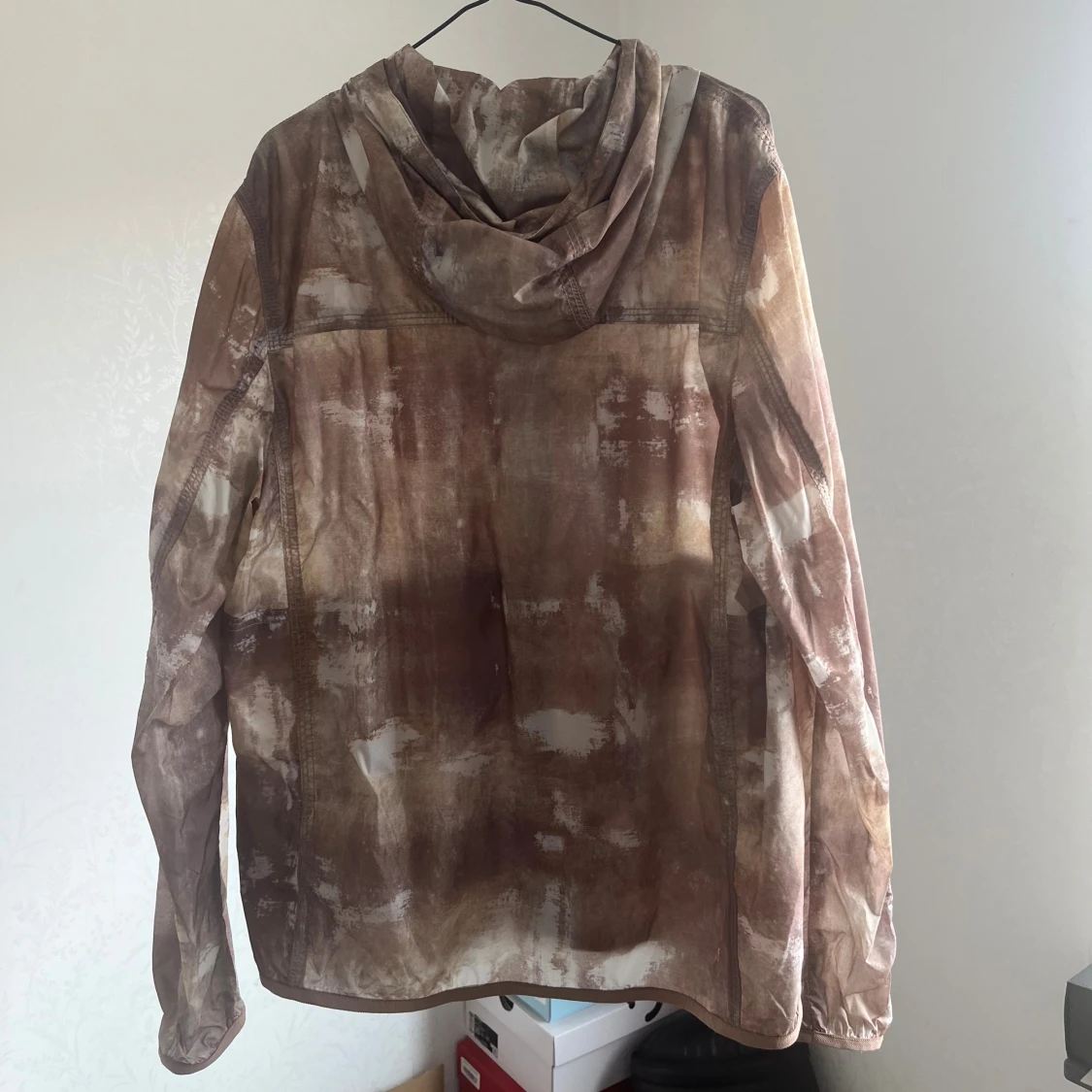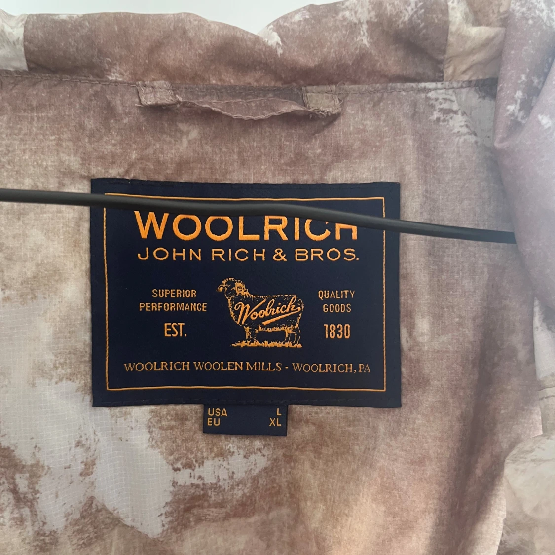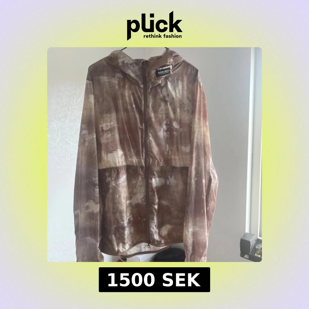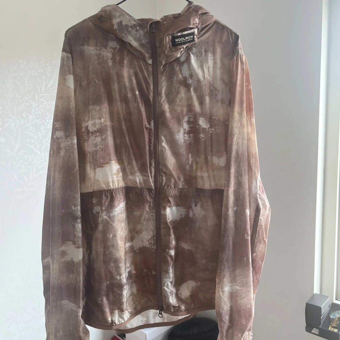 Säljer en sjukt snygg vindjacka från Woolrich. Jackan har ett unikt abstrakt mönster i olika bruna och beige toner, huva och hel dragkedja framtill. Perfekt för dig som gillar streetwear och vill sticka ut med en cool look. Storlek Large rätt så liten i storleken passar medium!