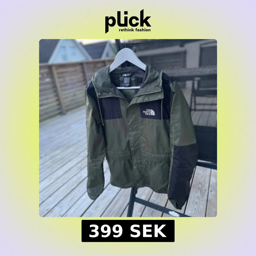 Säljer en grön och svart vindjacka från The North Face med huva och dragkedja. Jackan har logga på bröstet och ryggen samt flera praktiska fickor. Perfekt för utomhusaktiviteter och enkel att bära med sig.