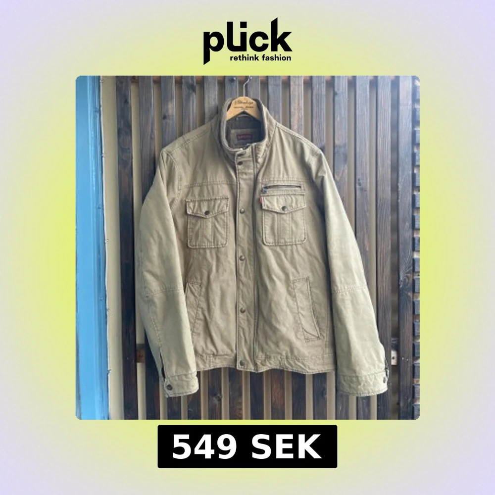 Sandfärgad jacka från Levi's med quiltat foder, ståkrage och flera fickor med både knappar och dragkedja. Fodrad och varm. Passar M/L.