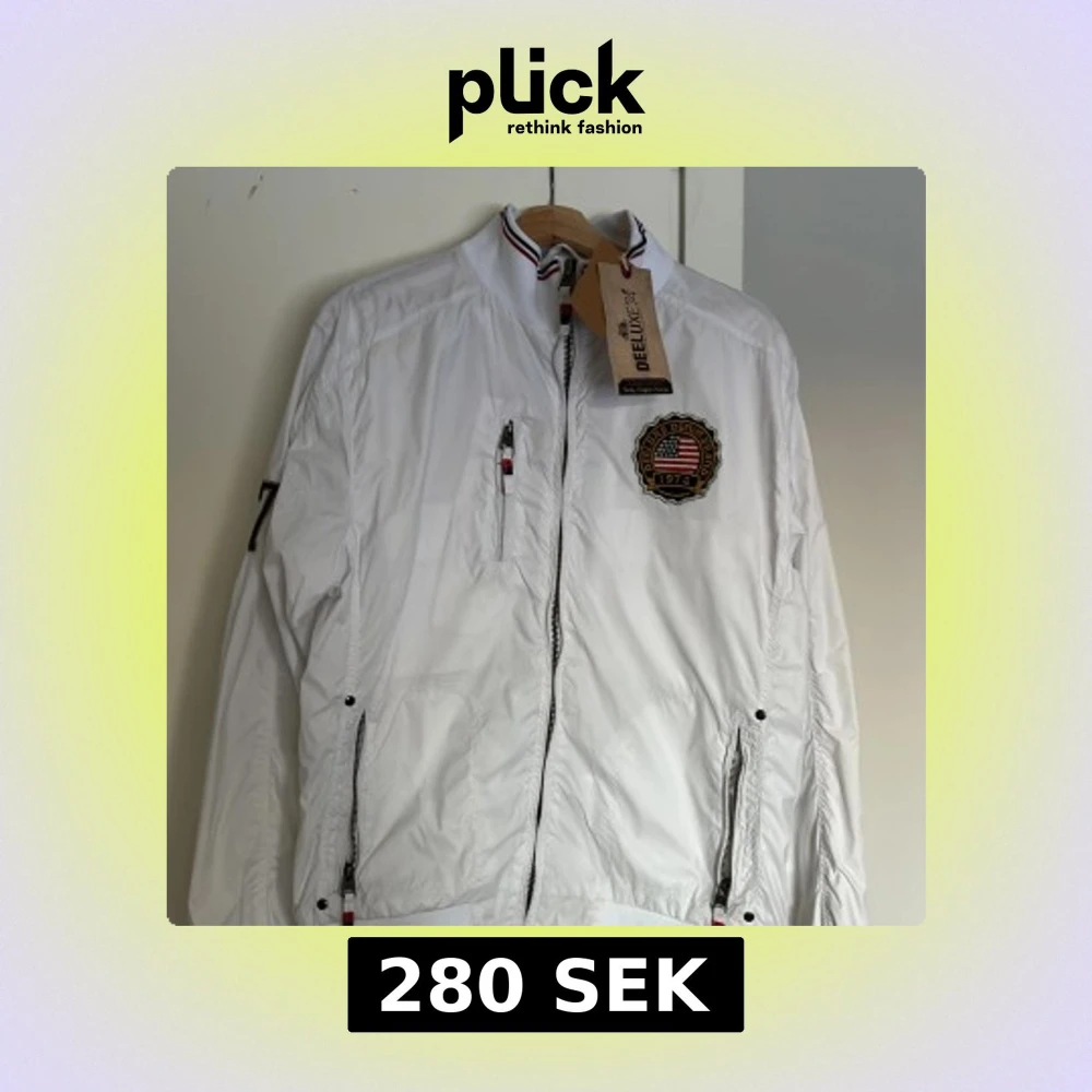 Vit jacka från Deeluxe med broderad detalj på bröstet. Jackan har en hög krage med randig kant och flera praktiska fickor. Storlek på jackan är XL men känns som L