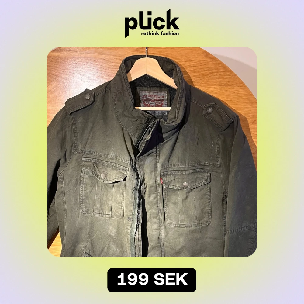 Säljer en grön jacka från Levi Strauss & Co. med dragkedja och knappar. Jackan har långa ärmar och två bröstfickor med lock. Perfekt för höst och vår.