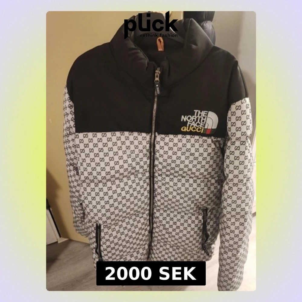 Exklusiv pufferjacka i samarbete mellan Gucci och The North Face. Jackan är svart upptill och vit nedtill med all-over GG-mönster, broderad logga på bröstet och dragkedja framtill. Fodret är orange och jackan har två fickor med dragkedja.