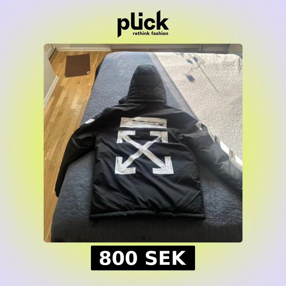 Svart pufferjacka från Off-White med ikoniska vita pilar på ryggen och vita ränder på ärmarna. Jackan har huva, dragkedja och stora fickor framtill. Perfekt för kyliga dagar och riktigt snygg streetstil. liten i storleken