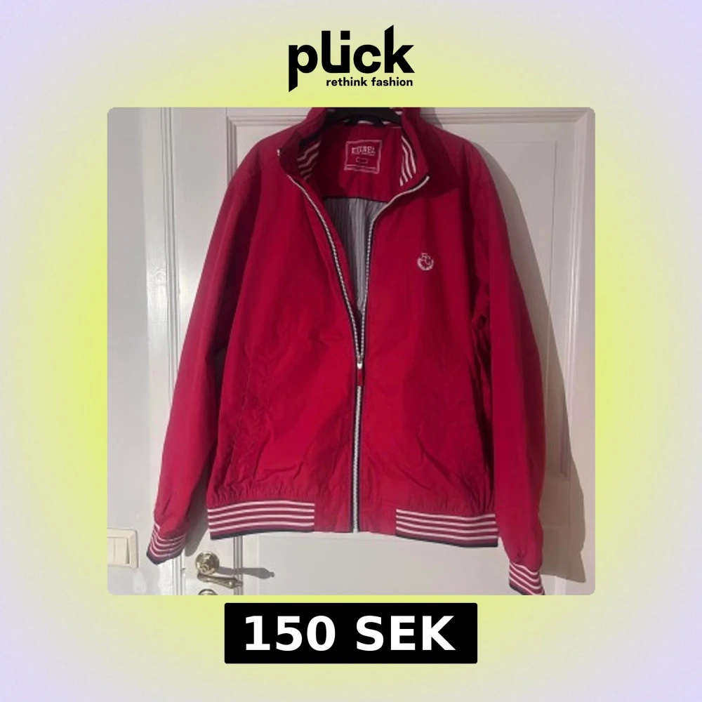 Snygg röd vindjacka från Etirel i storlek XL. Jackan har vita och röda ränder på muddar och krage, dragkedja framtill och broderad logga på bröstet. Perfekt för dig som gillar sportig och klassisk stil. Pris går att diskuteras. Köpare står för frakt.