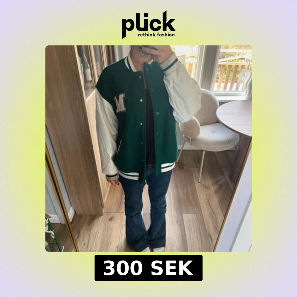 Säljer en grön och vit collegejacka från H&M Divided med bokstaven 'M' och texten 'Minnesota College'. Jackan har långa ärmar och stängs med knappar. Perfekt för en avslappnad stil.