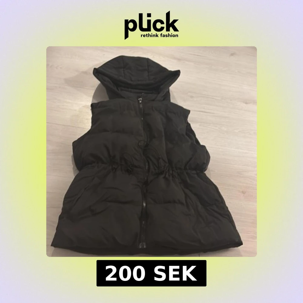Snygg svart dunväst med dragkedja och huva. Perfekt för kyliga dagar och ger en sportig look. Västen har en justerbar dragsko i midjan för bättre passform.