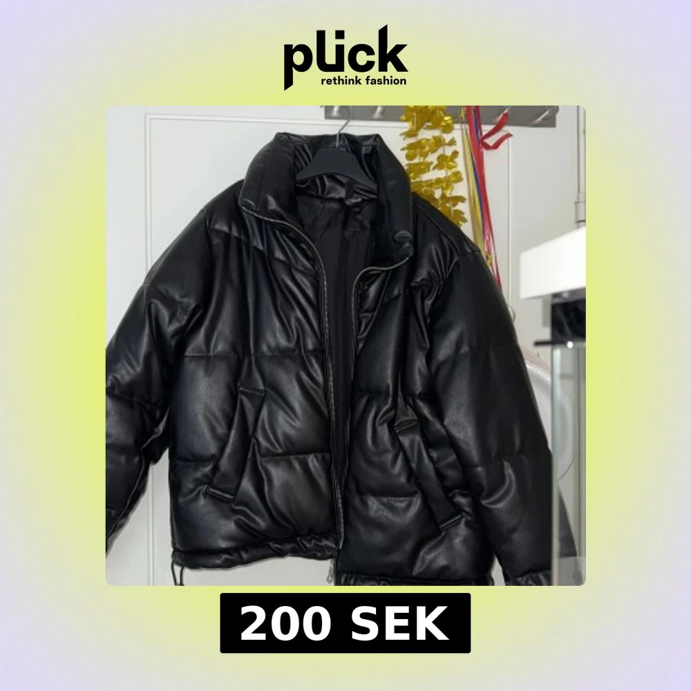 Säljer en svart pufferjacka med hög krage och dragkedja framtill. Jackan har en oversized passform och är tillverkad i syntetmaterial med quiltad design. Perfekt för kyliga dagar.