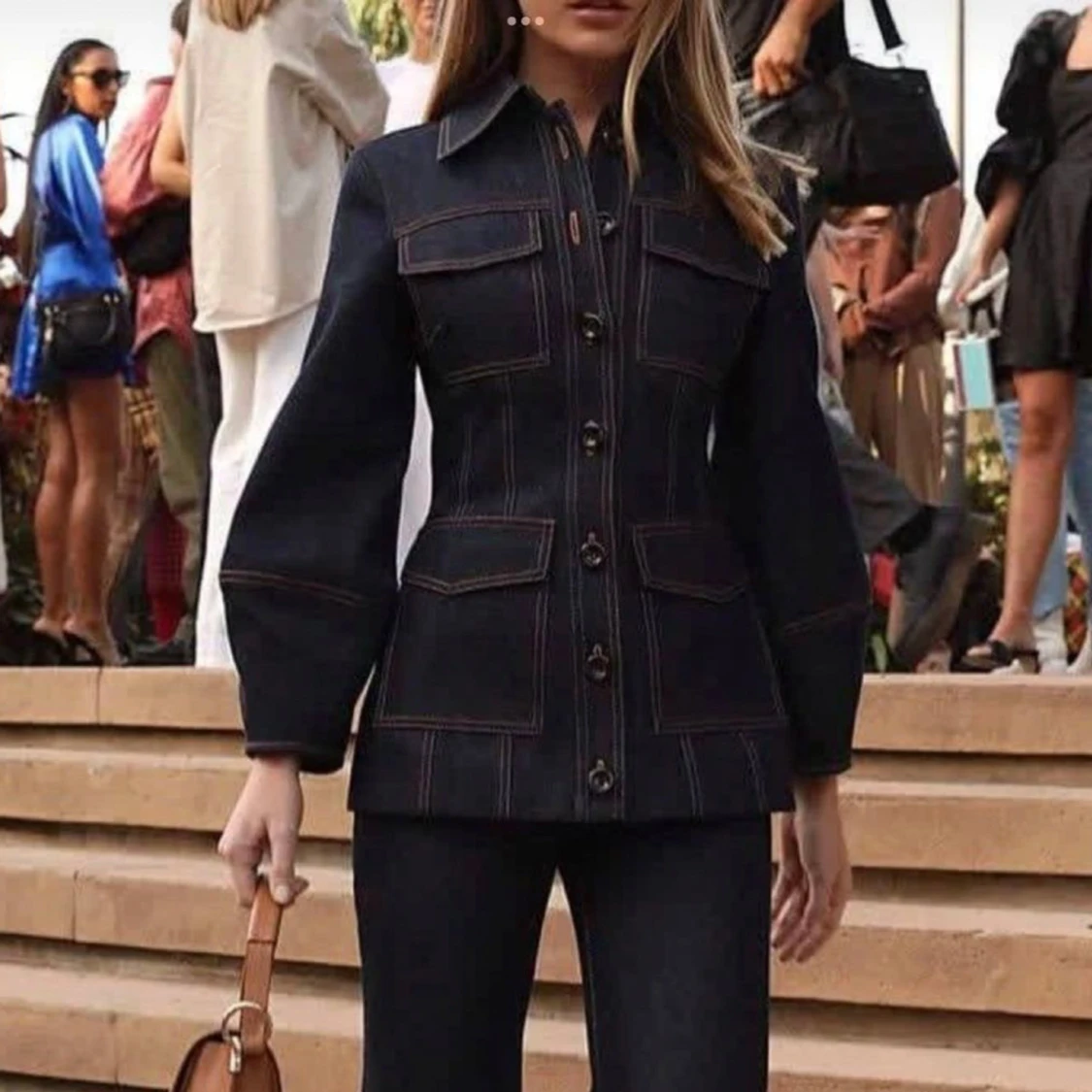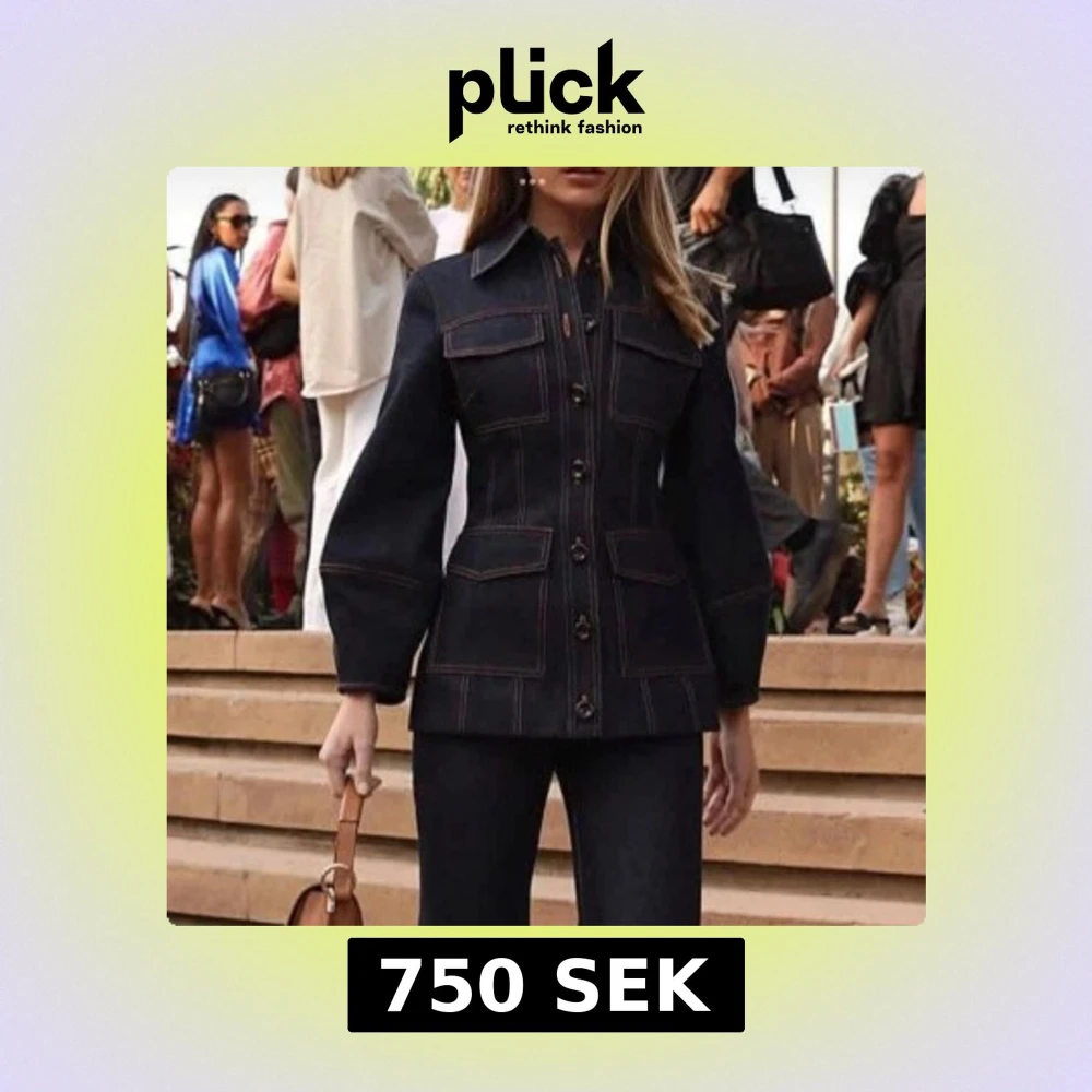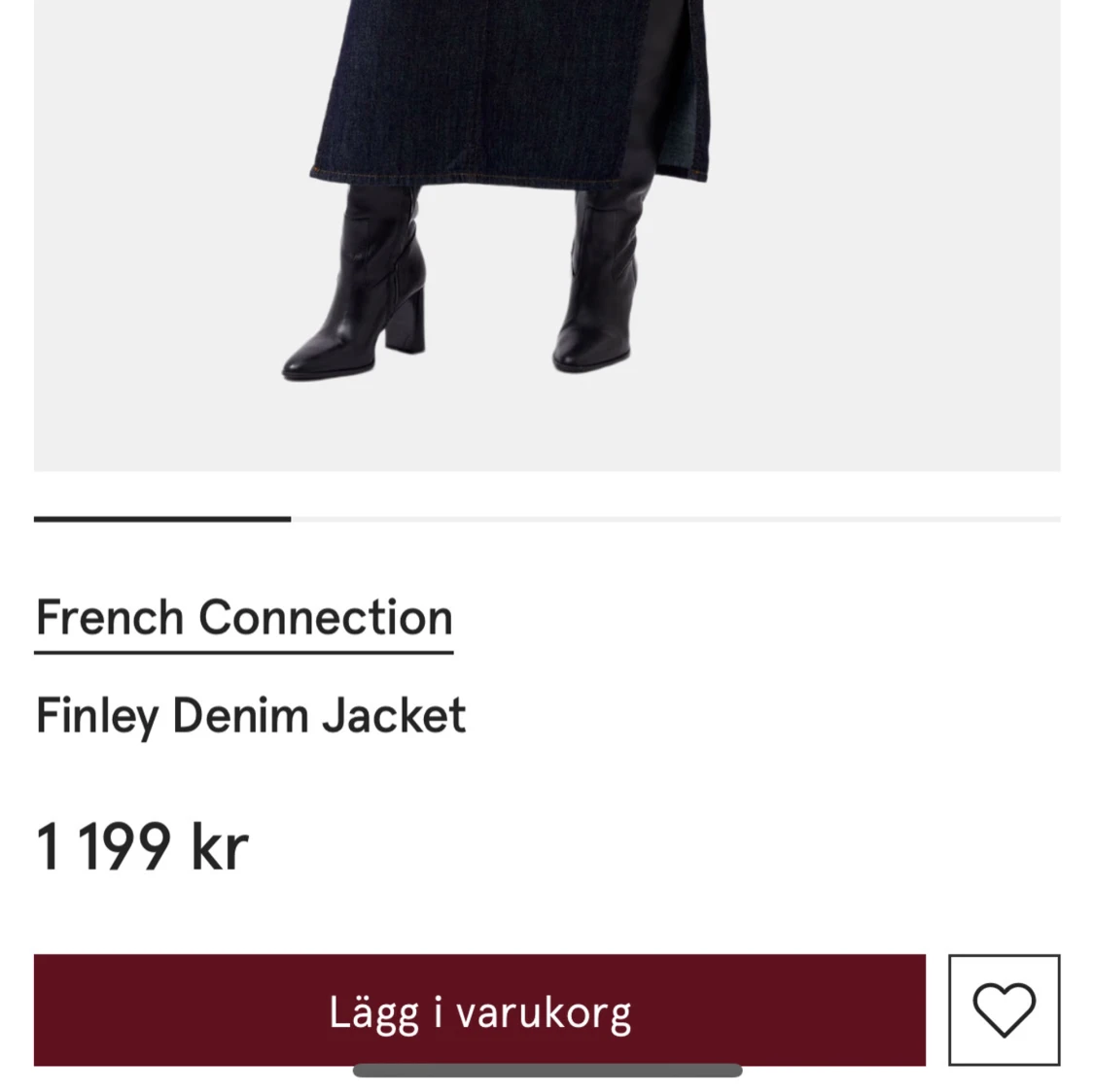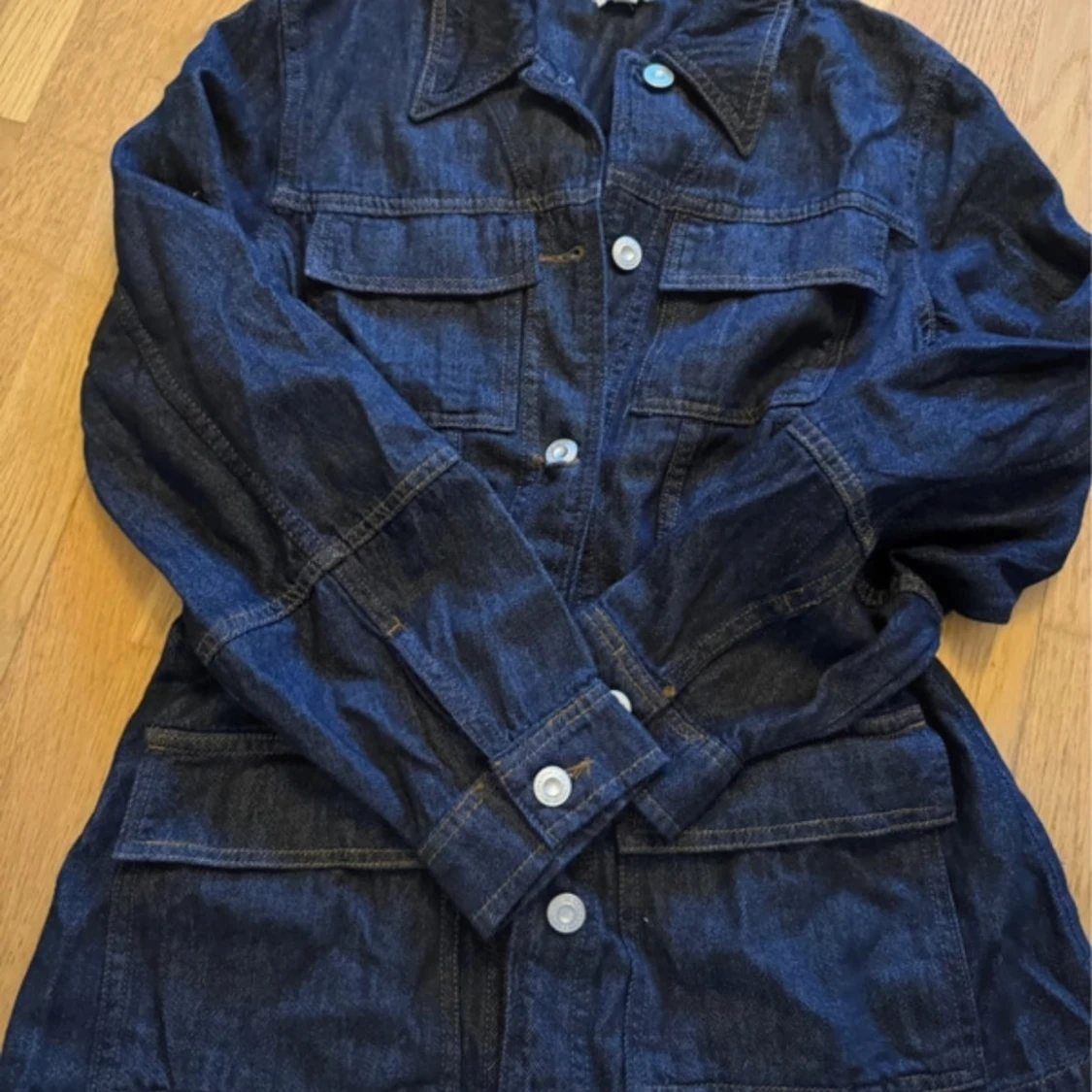 Snygg mörkblå jeansjacka från French Connection med markerad midja och stora fickor fram. Storlek 34/36
