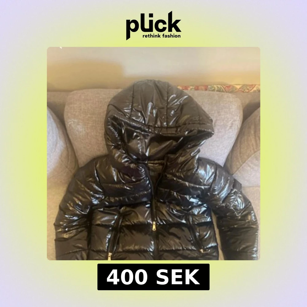 Säljer en svart, glansig pufferjacka med stor huva och dragkedjor på fickorna. Jackan har en quiltad look och är perfekt för kalla dagar. Den har långa ärmar och en riktigt snygg streetstil som sticker ut.