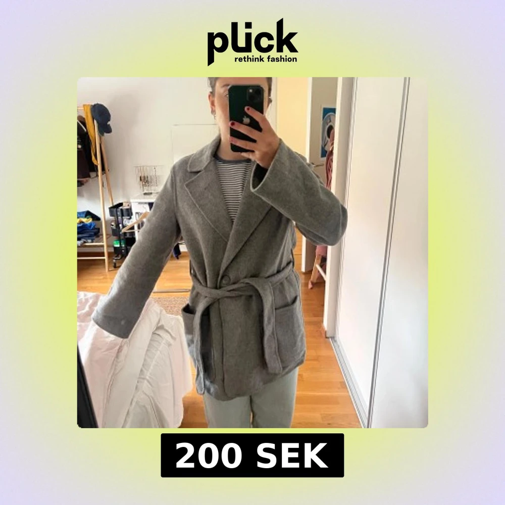Säljer en stilren grå kappa med bälte i midjan och stora fickor framtill. Jackan har bred krage och lång ärm, perfekt för kyligare dagar. Klassisk och enkel design som passar till många outfits.