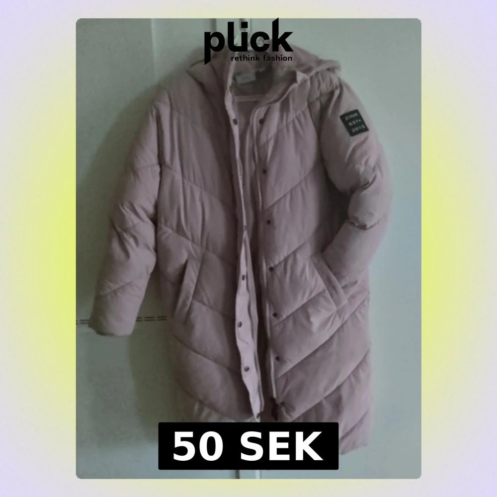 Säljer en ljusrosa pufferjacka från Zink med huva och snygga diagonala quiltade sömmar. Jackan har dragkedja och knappar framtill, två fickor och en patch på ärmen med texten 'ZINK EST. 2015'. Perfekt för kalla dagar.