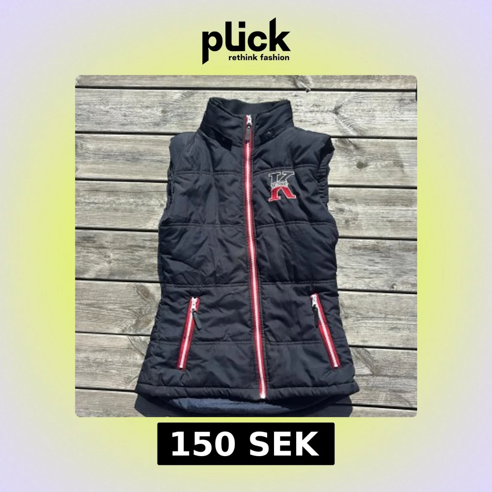 Svart quiltad väst från Kingston med hög krage och broderad logga på bröstet. Västen har röda och vita dragkedjor framtill och på fickorna, samt snygga detaljer vid kragen. Perfekt för lager-på-lager och sportig stil.
