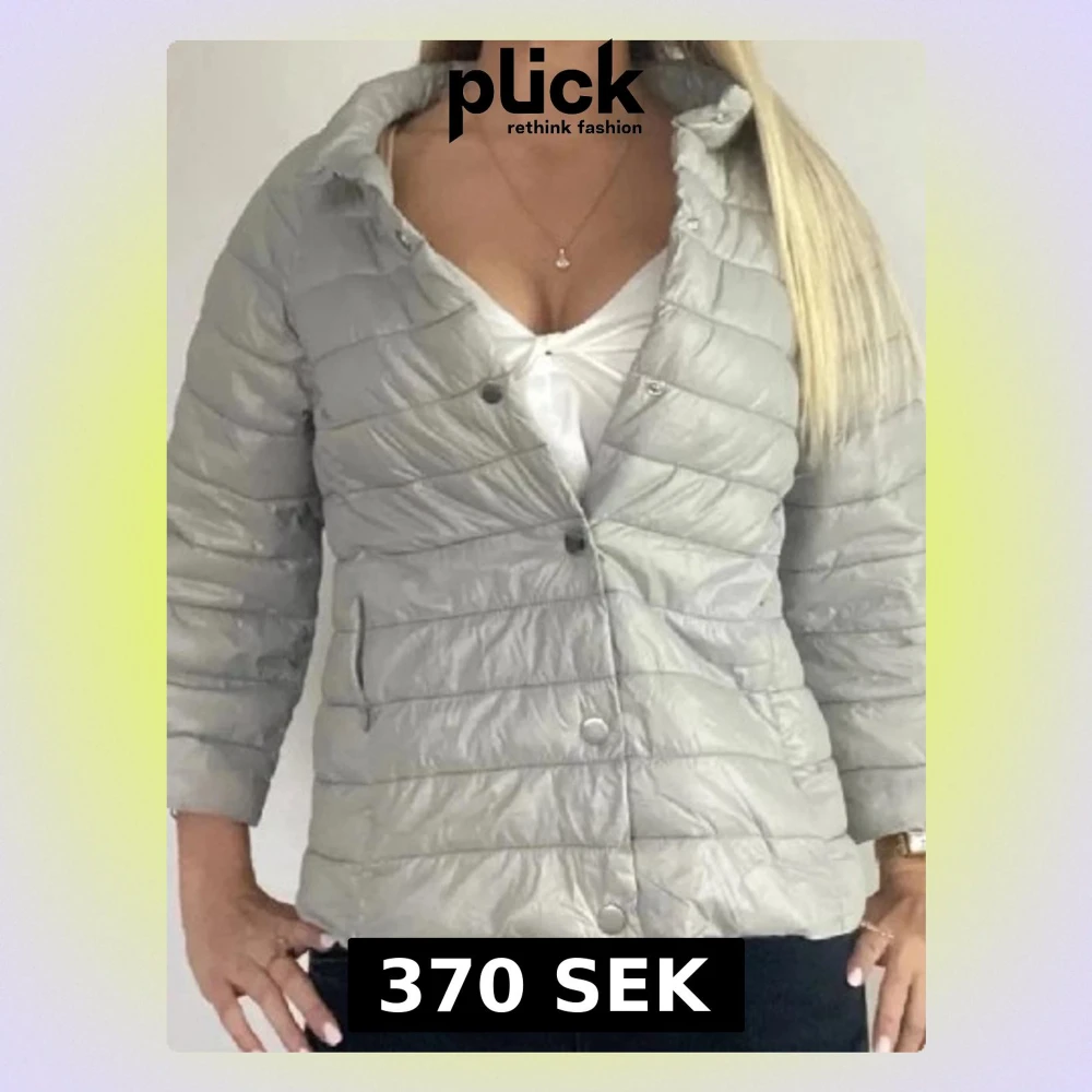 Säljer en ljusgrå pufferjacka med horisontella sömmar och tryckknappar framtill. Jackan har en hög krage och trekvartsärmar, perfekt för dig som vill ha en lätt och stilren jacka till vardags. Materialet är syntet och ger en glansig finish.