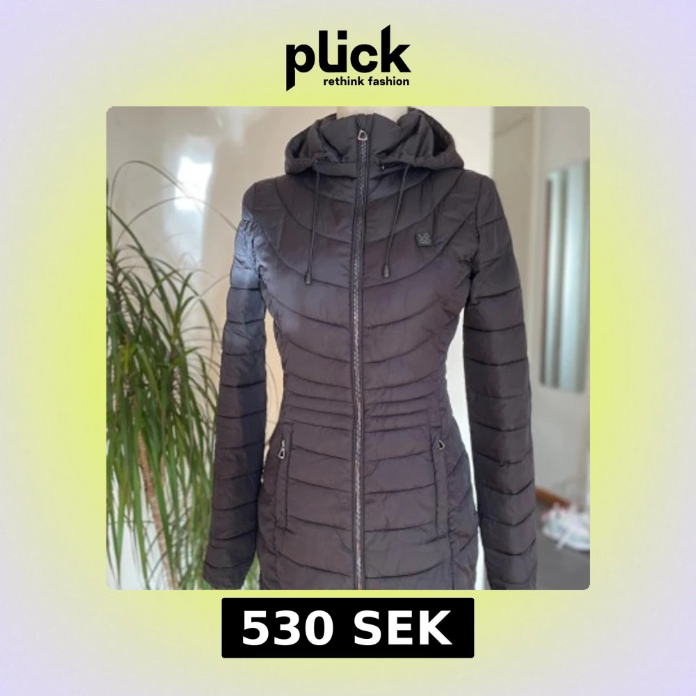 Snygg svart pufferjacka med figurnära passform och huva. Jackan har långa ärmar, dragkedja framtill och snörning vid huvan. Perfekt för kalla dagar med sin quiltade design och praktiska fickor med dragkedja.