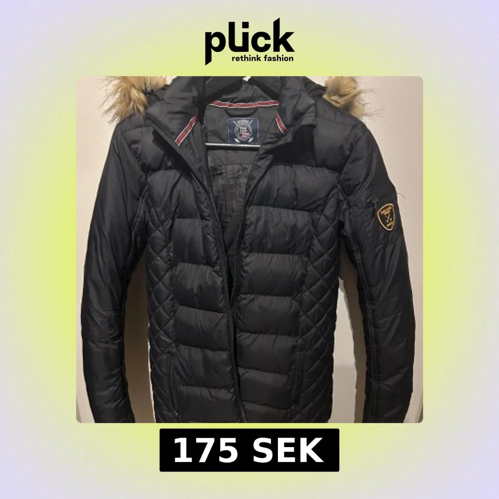 Jacka i fint skick. Syntetfodrad. Svart med luva, fuskpälsen på luvan är avtagbar. Stl 160/ XS.