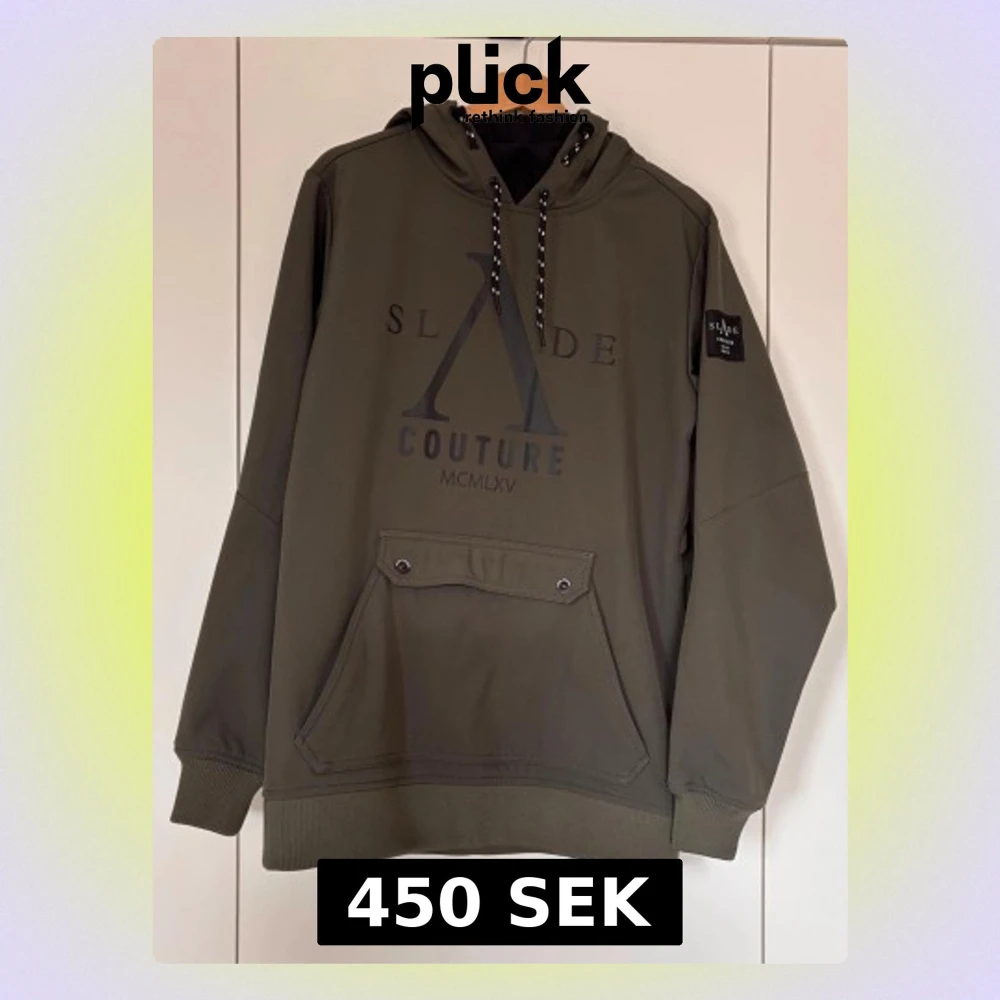 Säljer en grön skidjacka från Slade Couture i storlek XS. Jackan har huva med snörning, stor ficka framtill med tryckknappar och ribbade muddar. Stora logotryck både fram och bak.