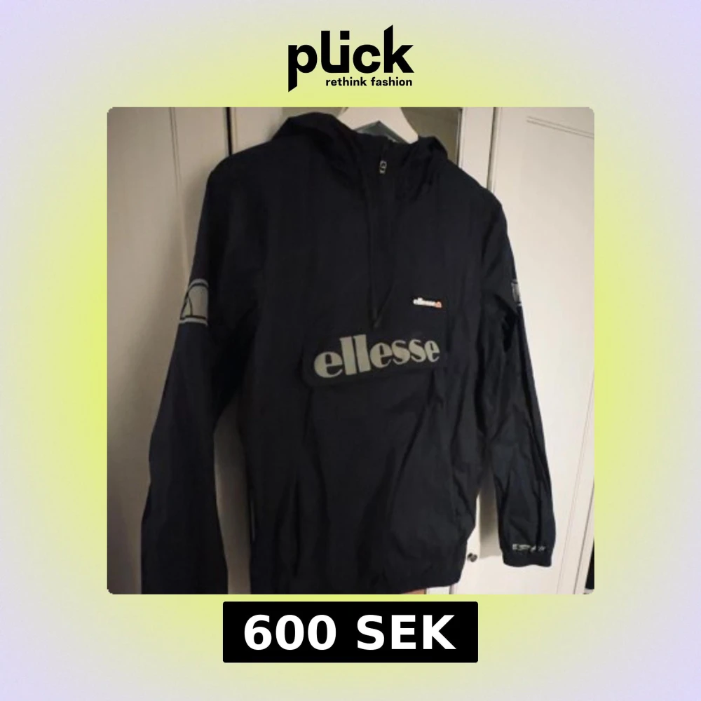 Säljer en svart vindjacka från Ellesse med stor logga på bröstet och mindre loggor på ärmarna. Jackan har en huva och dragkedja framtill. Perfekt för blåsiga dagar. De gråa detaljerna som texten på magen och loggan på armen är i reflex.