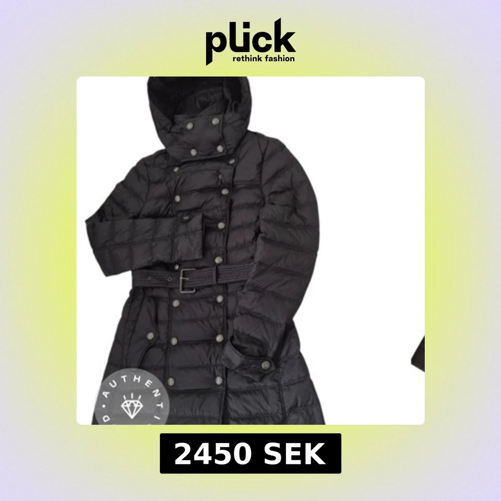 Snygg svart dunjacka från Burberry Brit med avtagbar huva, dubbelknäppning och bälte i midjan. Jackan har quiltad design, långa ärmar och klassiskt rutigt foder. Perfekt för kalla dagar när du vill vara både varm och stilren.