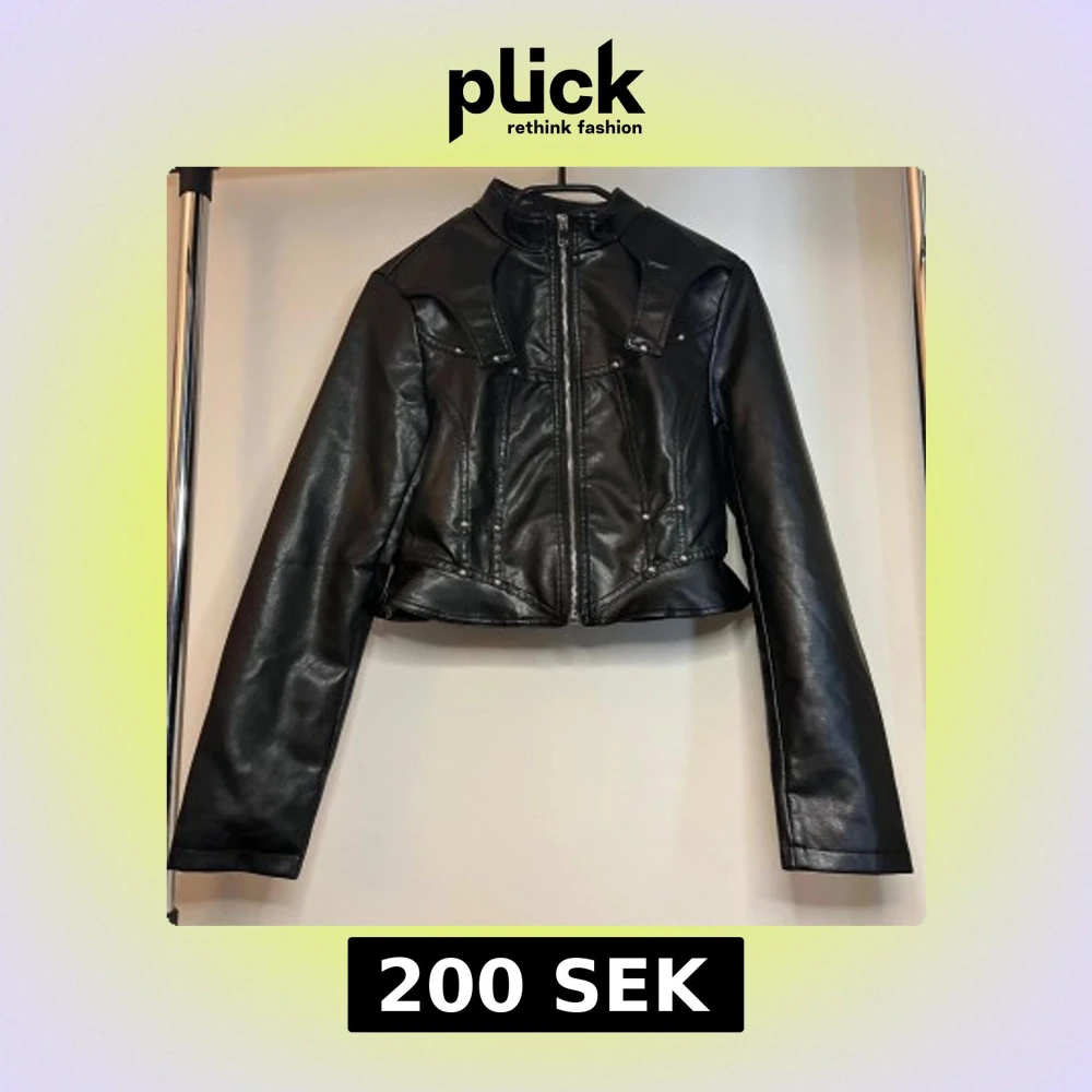 Snygg svart croppad skinnjacka med coola sömdetaljer och silvriga nitar. Jackan har hög krage, långa ärmar och dragkedja framtill. Perfekt för dig som vill ha en edgy look med lite biker-vibe.