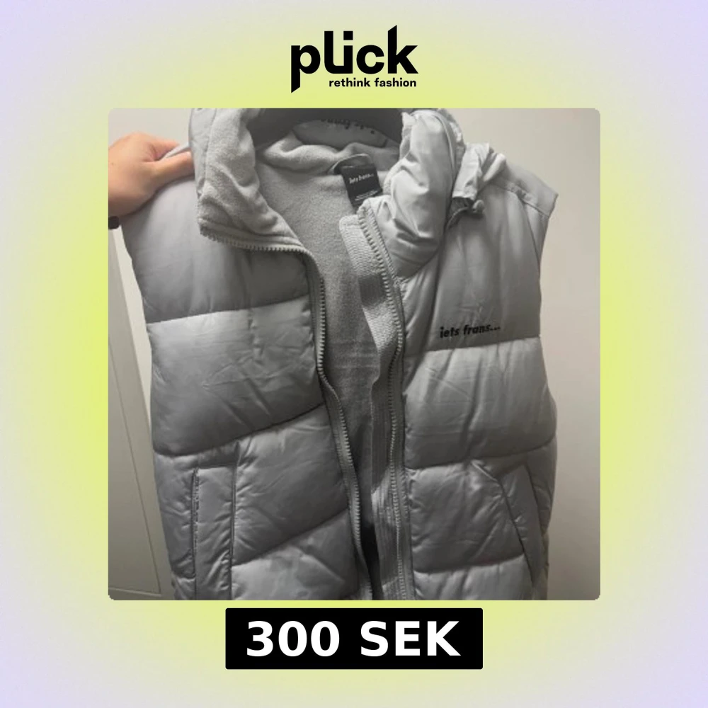 Snygg ljusgrå dunväst från iets Frans med huva och dragkedja framtill. Västen är quiltad och har två fickor på sidorna samt en hög krage. Perfekt för lager-på-lager och streetstyle.